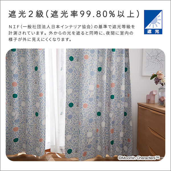遮光2級カーテンなので、日中は日差しがお部屋に入ってくるのを遮り、夜はお部屋の明かりが外に漏れるのを防ぎます。