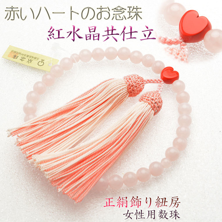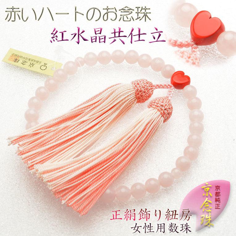 | 商品説明 | ◆優しいピンクの紅水晶に真っ赤なハートのアクセント 紅水晶の美しい数珠の艶と、気品に溢れた煌きは 見る人の心をとらえます 紅水晶は別名ローズクオーツとも呼ばれ、愛情を司る石と言われています 柔らかな淡いピンク色の球に、親珠の部分は真鍮製の赤いハートが模られてます 立体的なハートは、手元を美しく見せる、さりげないアクセントとなります 房は、しなやかに揺れる珊瑚色と薄桃の正絹仕様 京都の数珠職人が丹念に仕上げました 珊瑚色は、赤い珊瑚を粉末にした顔料の色を指し やや黄みがかった明るい赤色です 優雅な珊瑚色と清楚な薄桃の正絹房 淡い色合いの優しいツートーンカラー ・サービス化粧箱付 京都の数珠職人がお造りした、永くご使用頂ける御数珠を是非ご検討下さいませ ※数珠以外の数珠袋・数珠入れは別売です 京都の数珠職人がお作りした、永くご使用頂ける御数珠を是非ご検討下さいませ。 ※数珠以外の数珠袋・数珠入れは別売です。 |