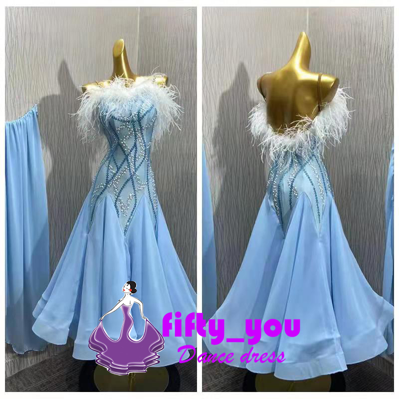 新品fifty_you セミオーダードレス レディース社交ダンス衣装  ダンスドレス  モダン競技ドレス  ファー飾 グローブフロート