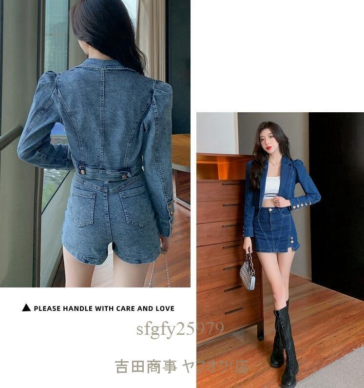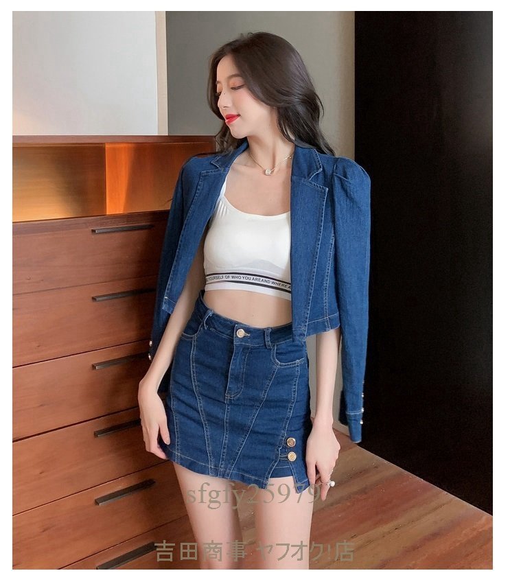 B0378☆新品デニムジャケット 2点セット ストリート ヒップホップ スリム ミニスカート L ダークブルー