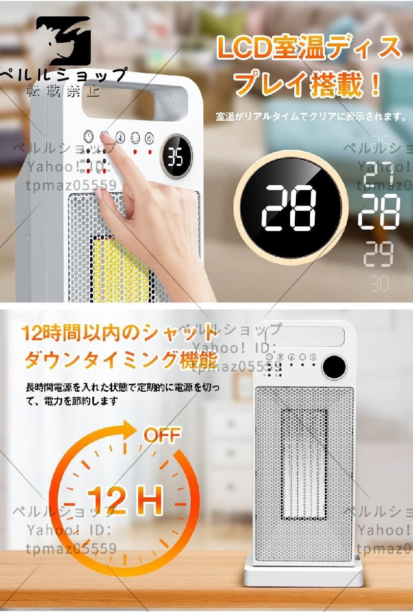 • 「2023年革新版リモコン操作可能なセラミックファンヒーター」革新版のセラミックヒーターは、従来の市販品に比べて、LCD室温ディスプレイを搭載しており、室温をリアルタイムでクリアに表示することができます。更に、ワンタッチで温度調節機能も搭載しており、35°の温度以内自分の習慣に合わせて自由にに調節できるだけでなく、室温が機器設定の温度に達すると機器も自動的に加熱を停止し、温度が高すぎることによる事故や安全上の危険を防止します。また、セラミックヒーターはリモコンも付いで、ソファーに座ったり布団に横になったりして遠隔操作ができてとても便利です。