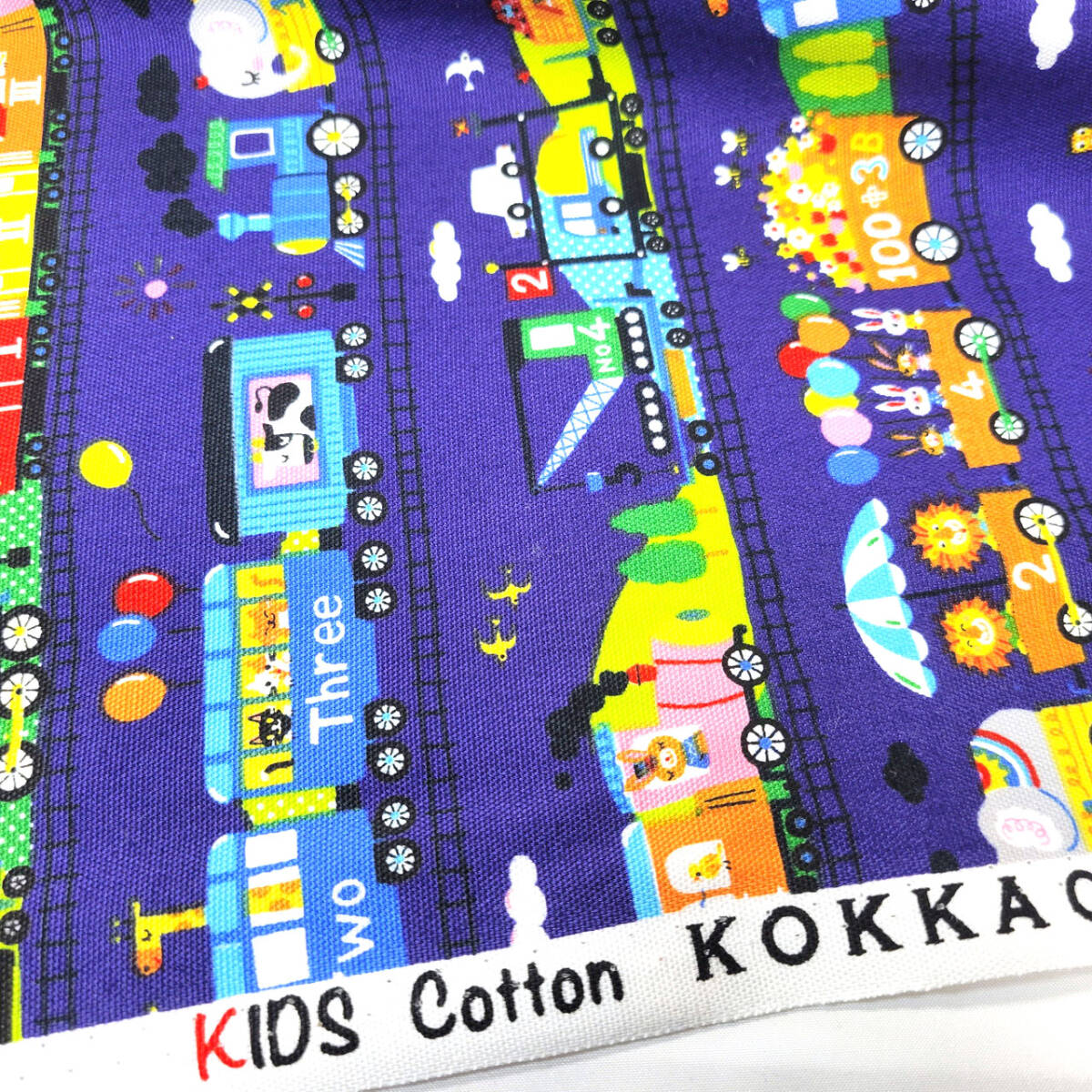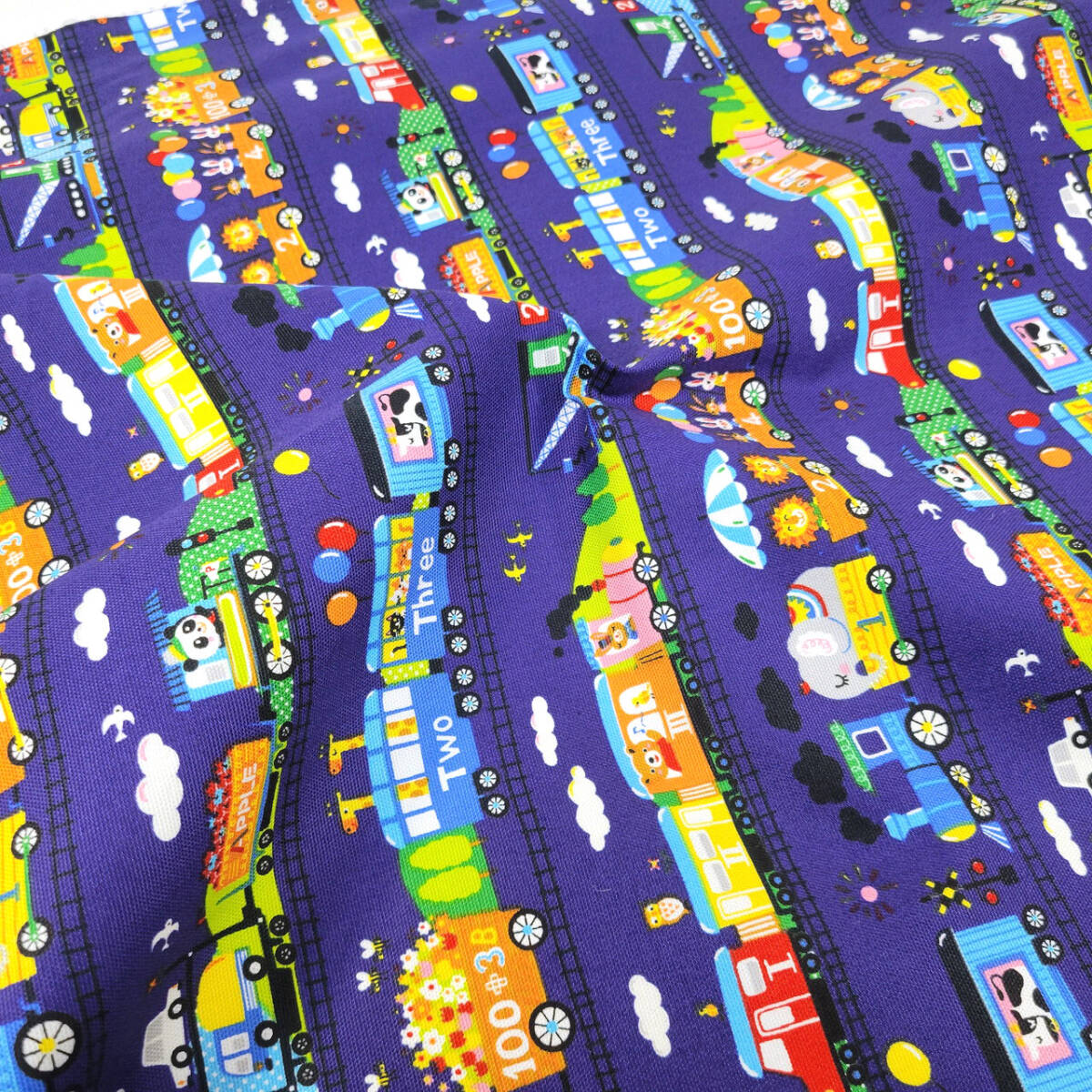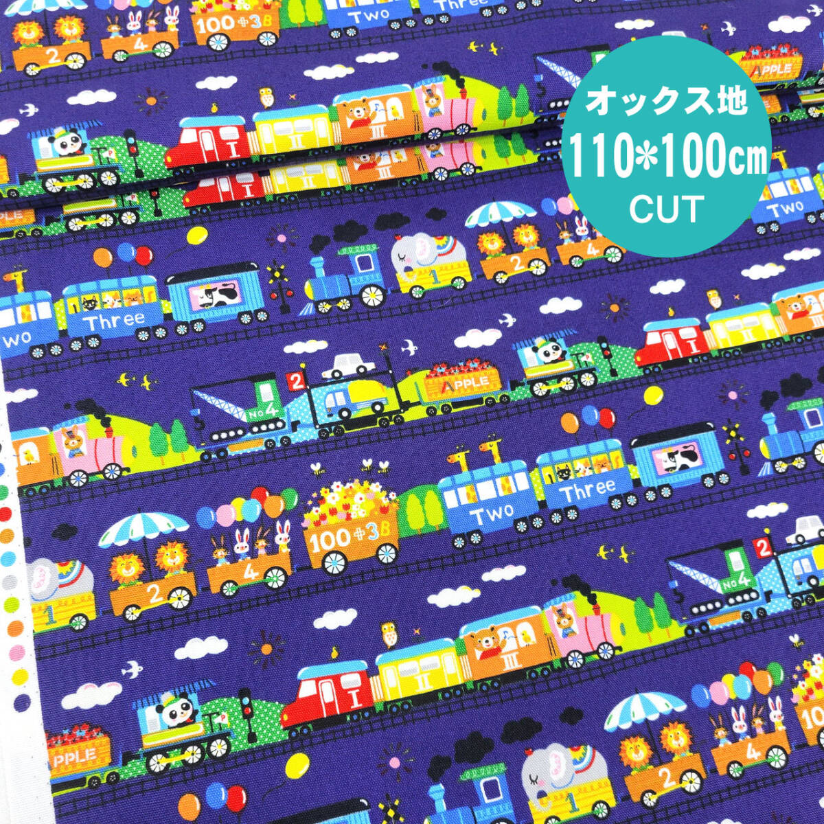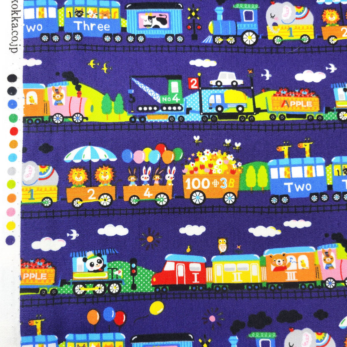 動物たちが仲良く電車でお出かけしている、かわいいオックス生地です。