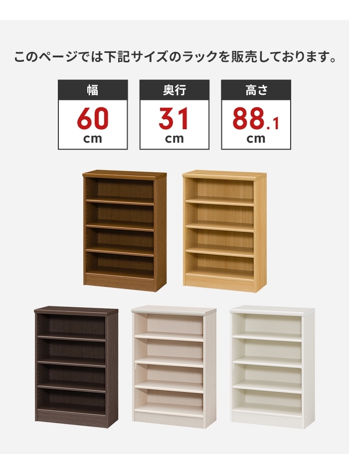 ※【同シリーズ】のリンクは当店のヤフオク店のページへ進みます。 エースラック/カラーラック 【本体(奥行31cm※共通)】 ● 高さ60cm 幅28.6cm/幅44.2cm/幅59.2cm/幅86.5cm/幅116.5cm ● 高さ88.1cm 幅28.6cm/幅44.2cm/幅59.2cm/幅86.5cm ダイワ/幅116.5cm ダイワ ● 高さ117cm 幅28.6cm/幅44.2cm/幅59.2cm/幅86.5cm ● 高さ149.9cm 幅28.6cm/幅44.2cm/幅59.2cm/幅86.5cm ● 高さ178cm 幅28.6cm/幅44.2cm/幅59.2cm/幅70.2cm/タフ 幅70.2cm/幅86.5cm ● 高さ200cm 幅28.6cm/幅44.2cm/幅59.2cm/幅70.2cm/タフ 幅70.2cm/幅86.5cm 【追加棚(奥行27.8cm※共通)】 ● 厚さ1.7cm 幅24.9cm(本体幅28.6cm用)/幅40.5cm(本体幅44.2cm用)/幅55.5cm(本体幅59.2cm)/幅66.5cm(本体幅70.2cm) ● 厚さ2.5cm(タフ) 幅66.5cm(本体幅70.2cm) ※このページは[本体(高さ88.1cm/幅59.2cm)]を販売しております。 |
