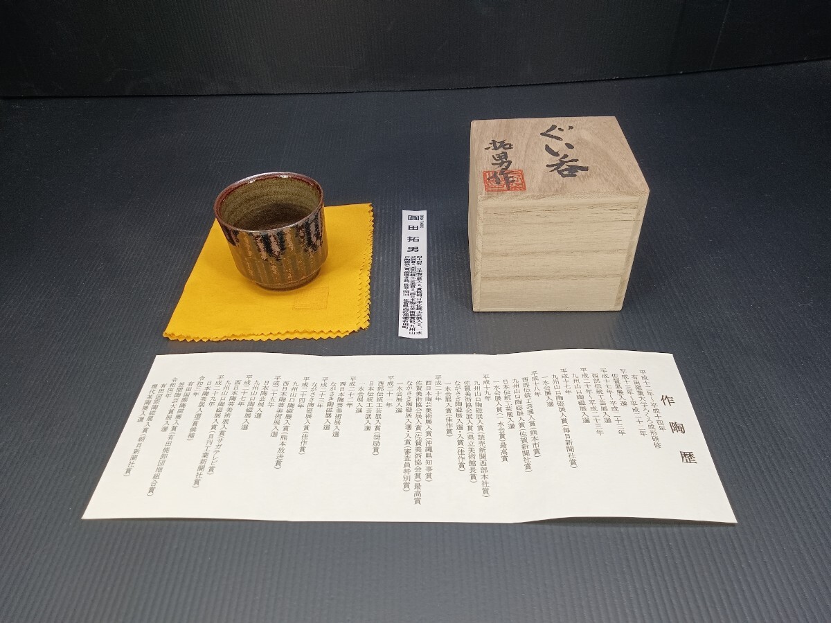 | 商品説明 | 品名:鉄彩ぐい呑 作家:圓田拓男 寸法:径6.6㎝ 高さ5.6㎝ 状態:新品 美術年鑑評価額44万円(評価基準 陶磁器(花瓶)21.2㎝×21.2㎝) 三代 唐山窯 圓田拓男 ●西日本陶芸美術展 沖縄県知事賞 サガテレビ賞 ●西部伝統工芸展 熊本市賞 奨励賞 ●一水会展 一水会賞(最高賞) 佳作賞 ●九州山口陶磁展 毎日新聞社賞 佐賀新聞社賞 読売新聞西部本社賞 日刊工業新聞社賞 ●有田国際陶磁展 朝日新聞社賞 有田焼卸団地組合賞 ●佐賀美術協会展 佐賀美術協会賞(最高賞) 県立美術館長賞 ●ながさき陶磁展 佳作賞 審査員特別賞 ●日本陶芸展 賞候補 ●日本伝統工芸展 現代茶陶展 笠間陶芸大賞展 佐賀県展等、多数入選 |