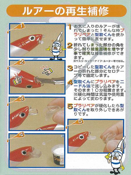 | 商品説明 | プラスチック製品の割れ・折れを修繕・補強(リペア)するための製品です。 専用の”粉”と”液”を混ぜて硬化させます。 部品折れ、欠け、補修や再生、ねじ穴再生など・・・ あきらめていたこんなモノまで!?修理できます! プラリペアという商品に初めて興味を持たれた方で、何を買えばよいかお困りの場合は、この製品が最適です。 利用例をご用意いたしました、参考になさってください。 ※プラリペアシリーズの他の製品の例も含まれております、ご注意ください。 【セット内容】 プラリペアパウダー(透):6g プラリペア専用リキッド:10mL 専用ニードル スポイト リキッド用容器 型取くん1本 取り扱い説明書 チョットした修理に最適なキットです。 修理する部品の色に合わせてお選び下さい。 ・割れ、折れ、欠けの接着剤で困っていませんか? ・模り(かたどり)も出来るプラリペアです。 ・車のパーツの修復、オートバイのカウル、ねじ穴の修復、おもちゃ、 パソコンなどあなたの大切な物の修復にプラリペアは欠かせません。 ・諦めてしまう前にぜひ、一度お試し下さい。 ・【プラリペアの長所】 ・エポキシ系より硬化が早く5分で固まります。 ・使いやすいので、なんでも修理したくなります。 ・瞬間接着剤など一度使ってまた使うとき中身が固まって使えないなんて経験ないですか? ・プラリペアは、粉と液の必要な分だけ使えます。 ・固まるとアクリル樹脂なので強度もバッチリです。 ・強度が強くノートパソコンなどのヒンジ部分もOK! ・硬化が早く5分で固まり仕事が速く進みます。 ・接着でのご使用でしたら少しの量で、経済的です。 ・必要な分量だけ混ぜて使いますので、長期保存可能です。 |