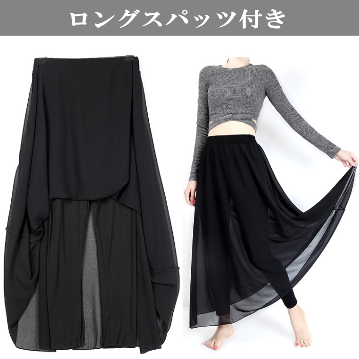 ダンス衣装 スカート付きパンツ(ブラック-裾レギュラー) レギンス パンツ 体型カバー シフォン スパッツ レギパンcy5n-pa3