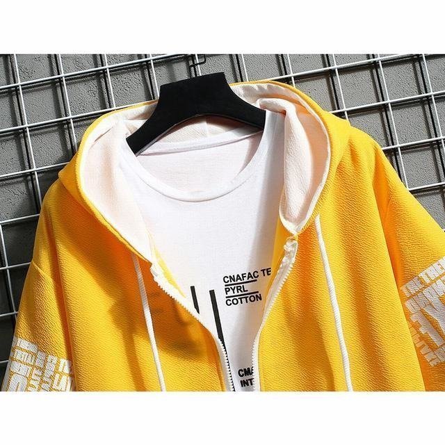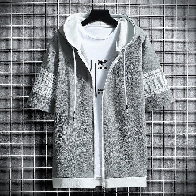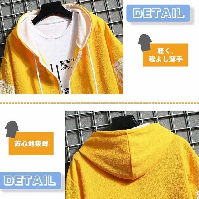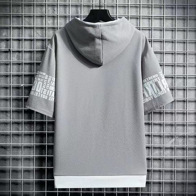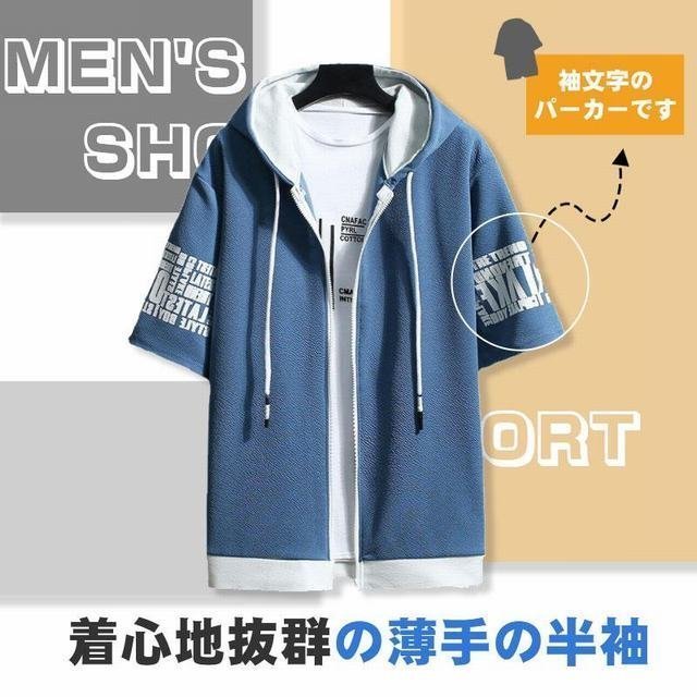 半袖 夏 涼しい 切り替え パーカー メンズ ジップアップ 前開き フード 袖文字 五分袖 トッ ライトグレーL