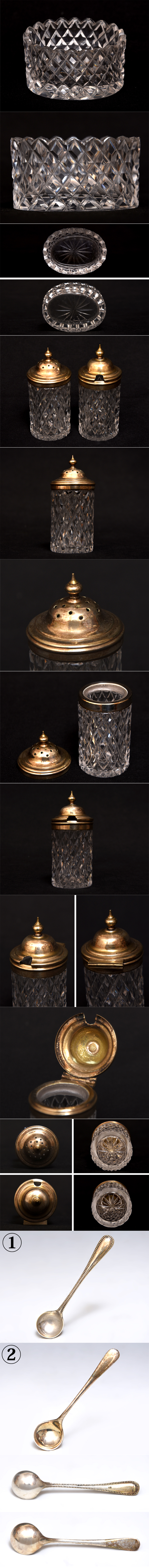 英国バーミンガム「Thomas Woolley」で1890年頃に製作された卓上調味料入れセットです。 塩コショウ入れとスパイス用のガラス器の3つがシルバープレートにキレイにセットされています。 ハンドルの曲線や台座のフォルム、ダイヤ模様のカットガラスは美しく、 食卓を華やかに彩ります。 付属のスプーンに関してはオリジナルかどうかはわかりかねますが、古い時代のものです。 台座裏面に「T.W」の他にホールマークや「411」と打刻されています。 経年によるスレや金属製品特有の変色等が見られますが、総じてコンディションは良好です。 ※撮影の際に生じた写り込みなどがございます。 ご理解の程よろしくお願い致します。 |
