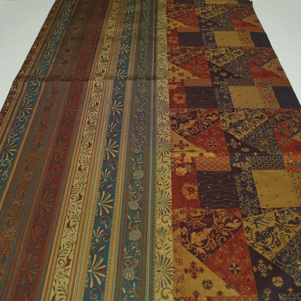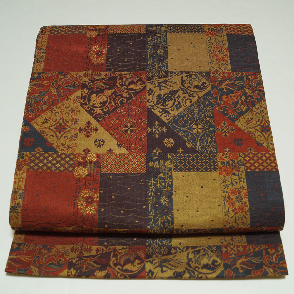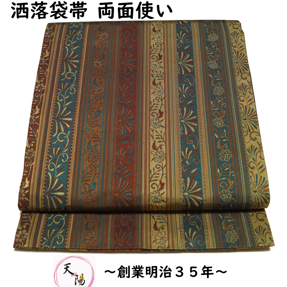 | 商品 説明 | 間道に枝花模様が織られた面と、市松取に更紗模様などが織られた面の両面リバーシブルの洒落袋帯です。 |