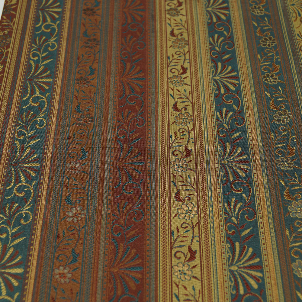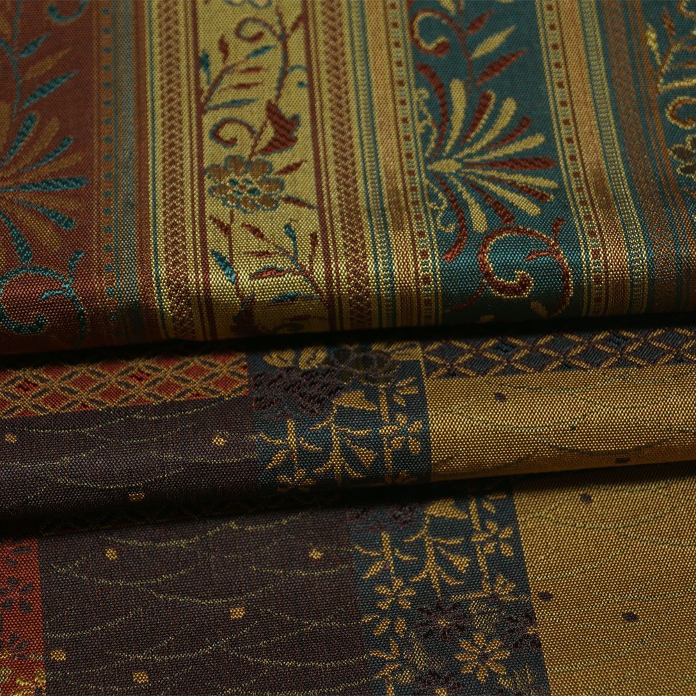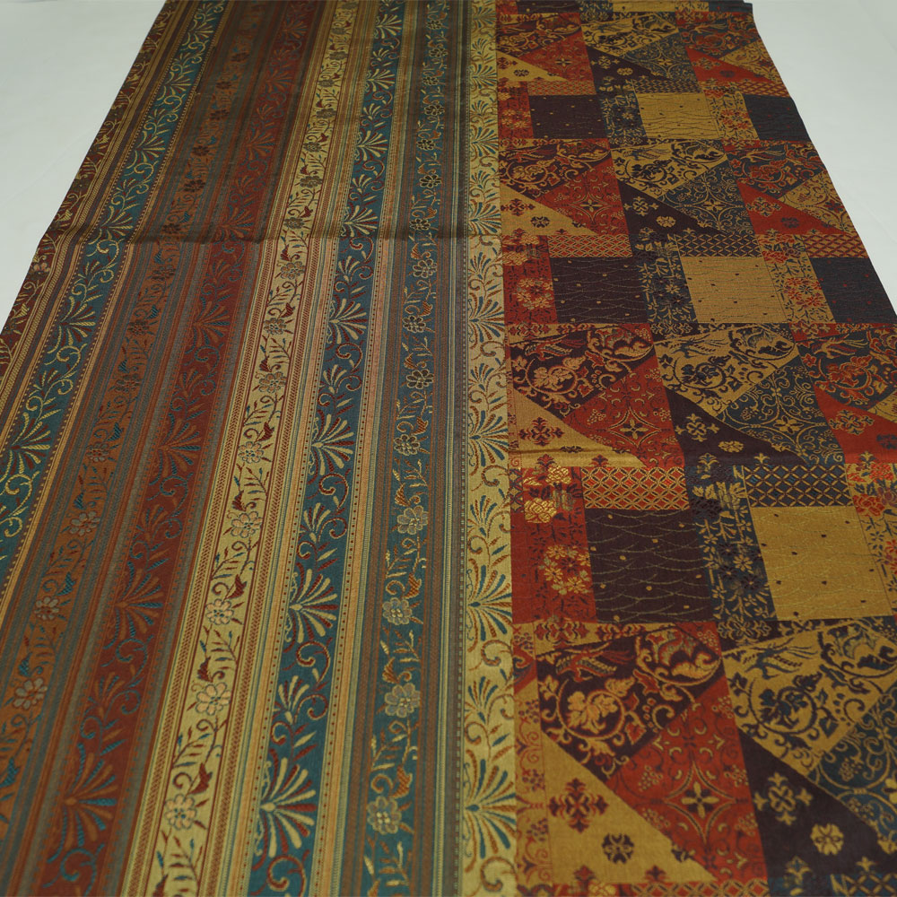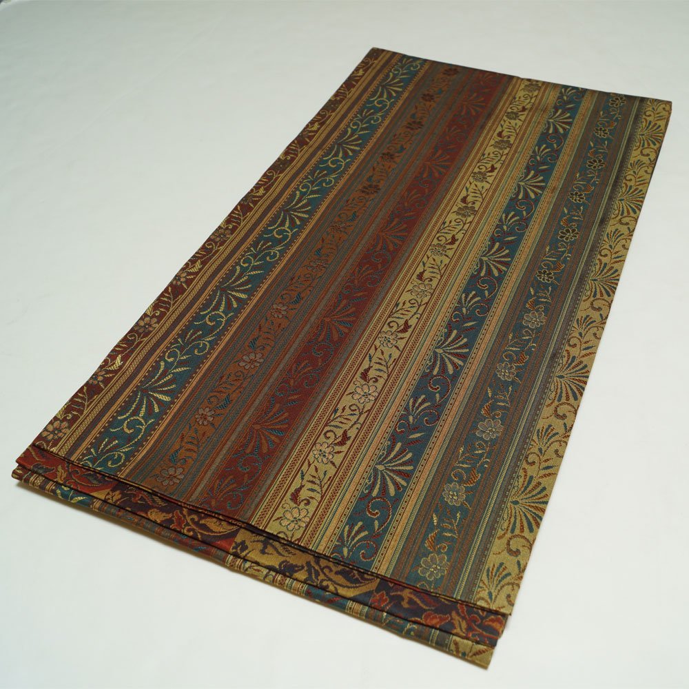 | 商品 説明 | 間道に枝花模様が織られた面と、市松取に更紗模様などが織られた面の両面リバーシブルの洒落袋帯です。 |
