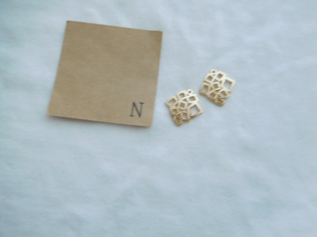 小さいスクエアがたくさん集まったゴールドピアスです。大人な雰囲気でつけていただけそうです。タートルネックやシャツ、ブラウスなどにも。