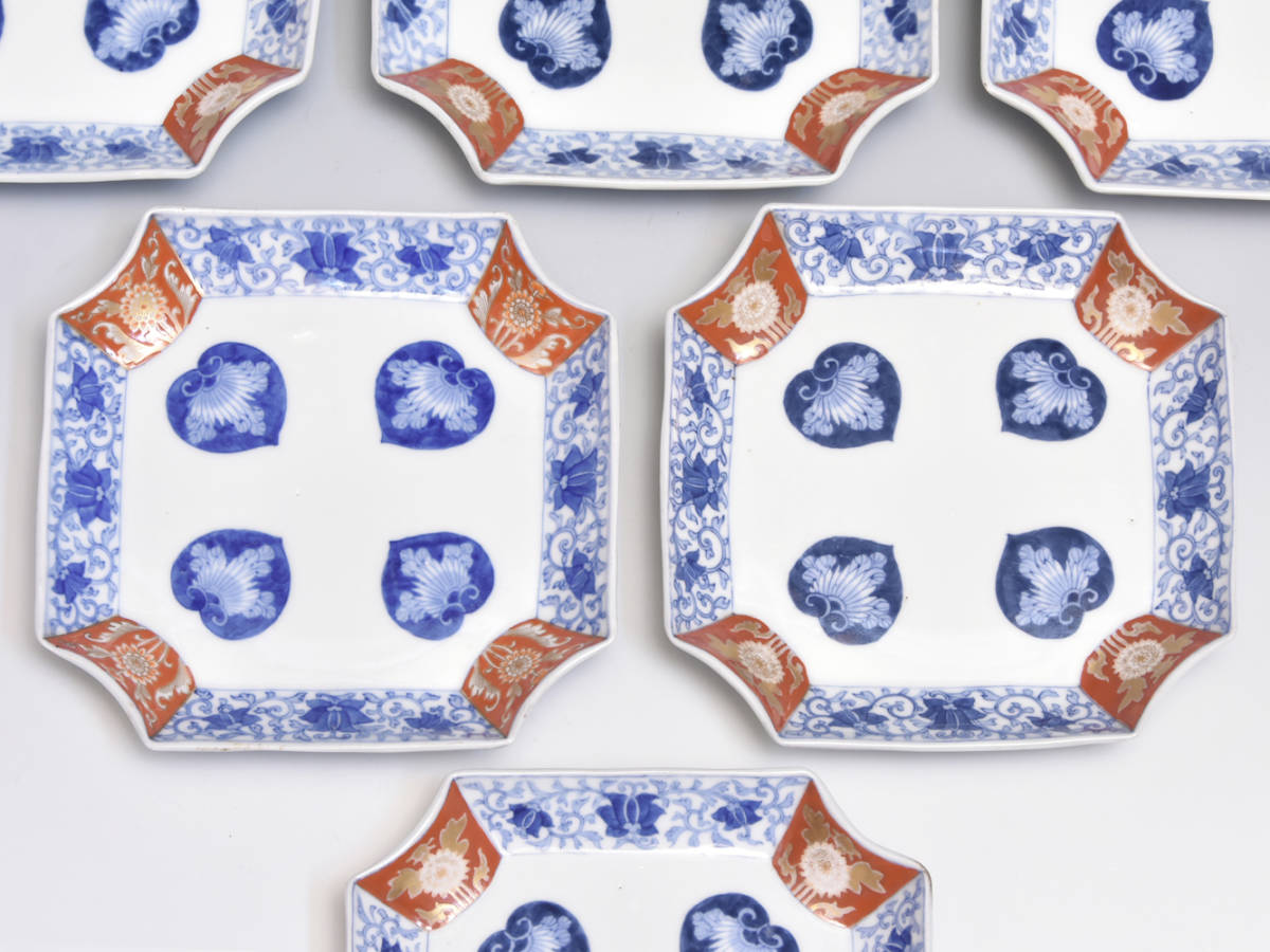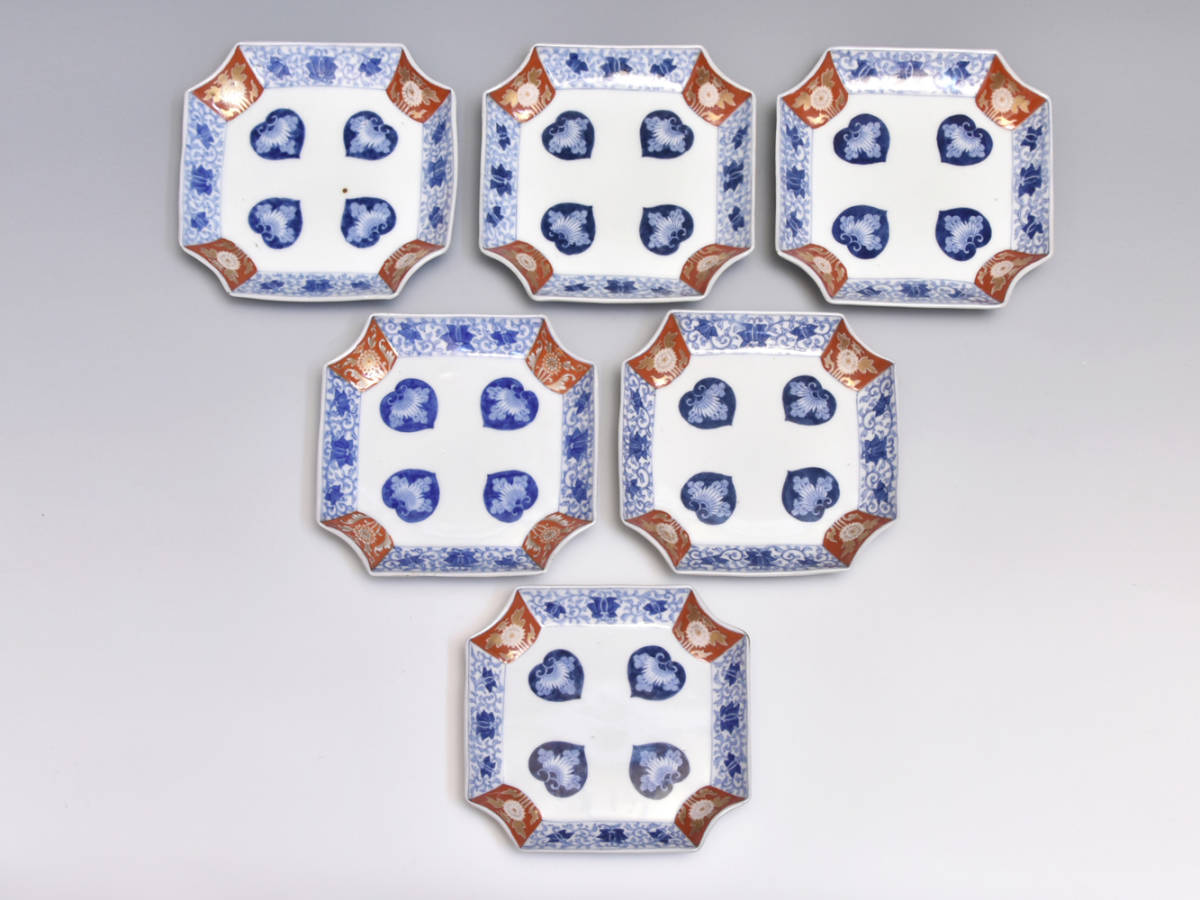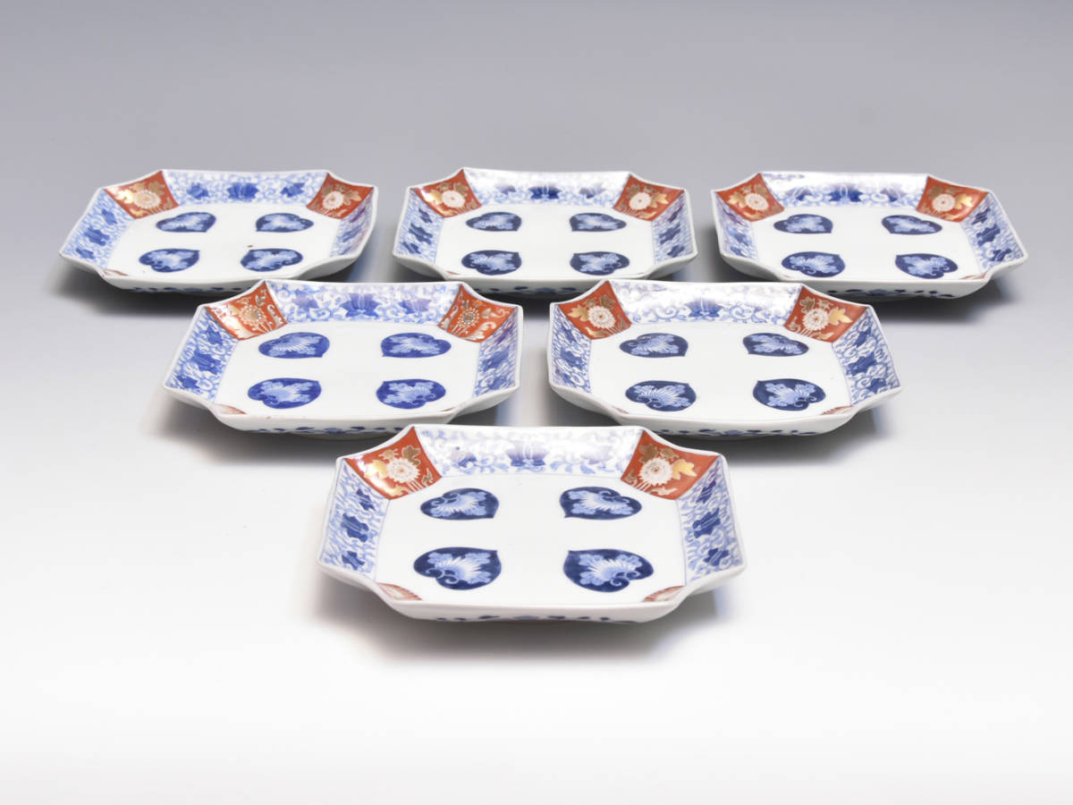 大正期~昭和初期頃 オールド深川 金彩色絵花文変形皿6枚 懐石道具 料理皿 向付 オールド香蘭社 美品 |