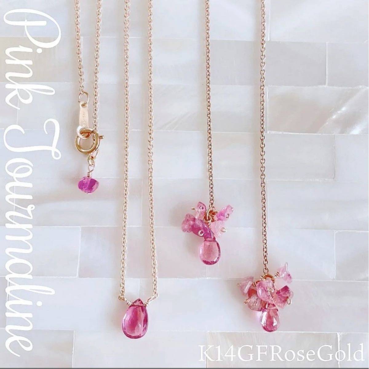 ローズゴールドのK14GFチェーンと、透明度の高い上質な天然トルマリンでジュエリーライクなデザインに♪