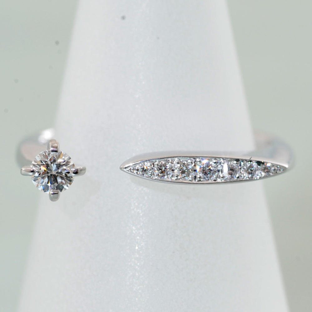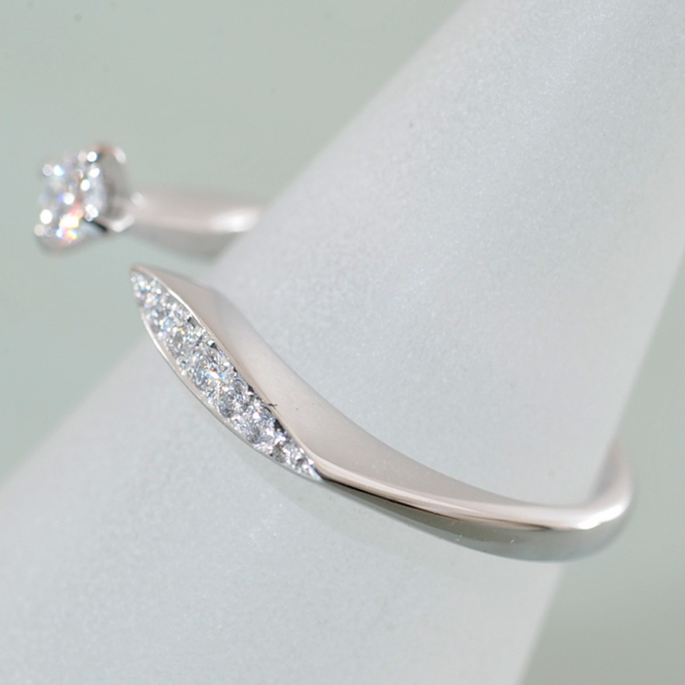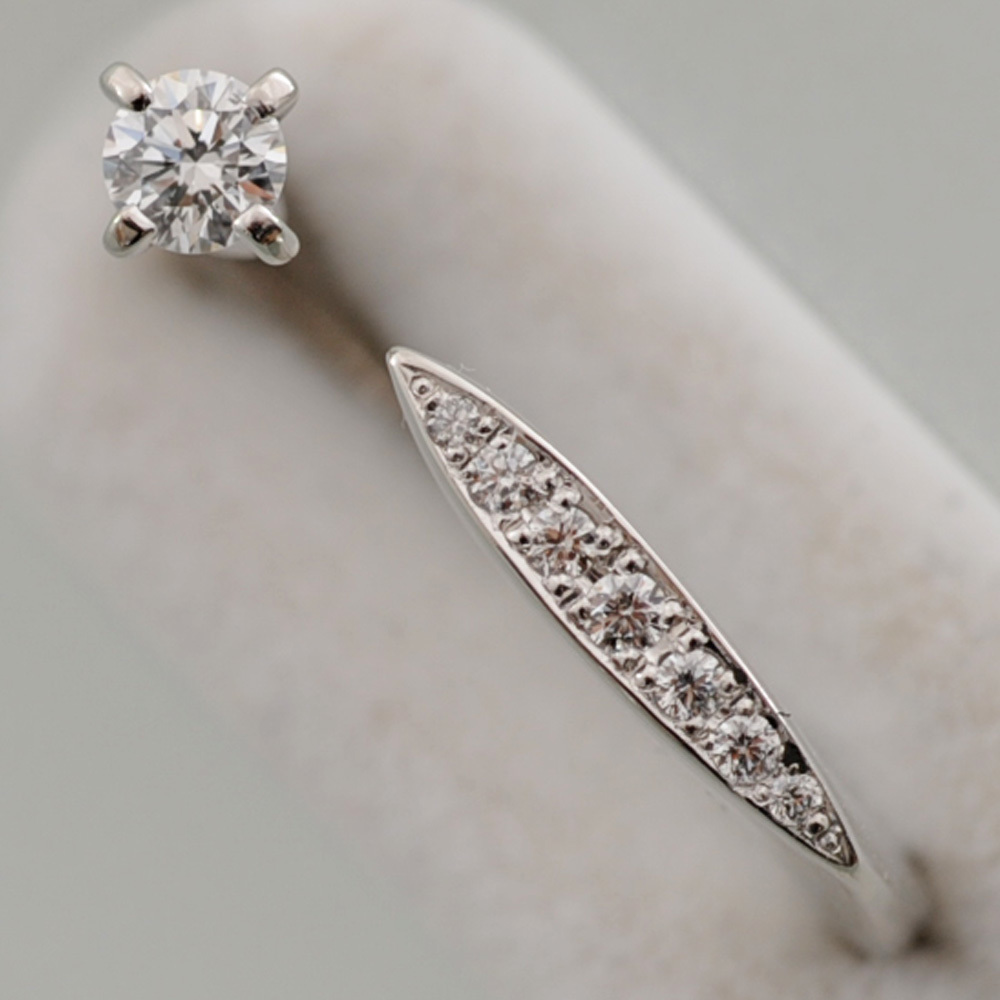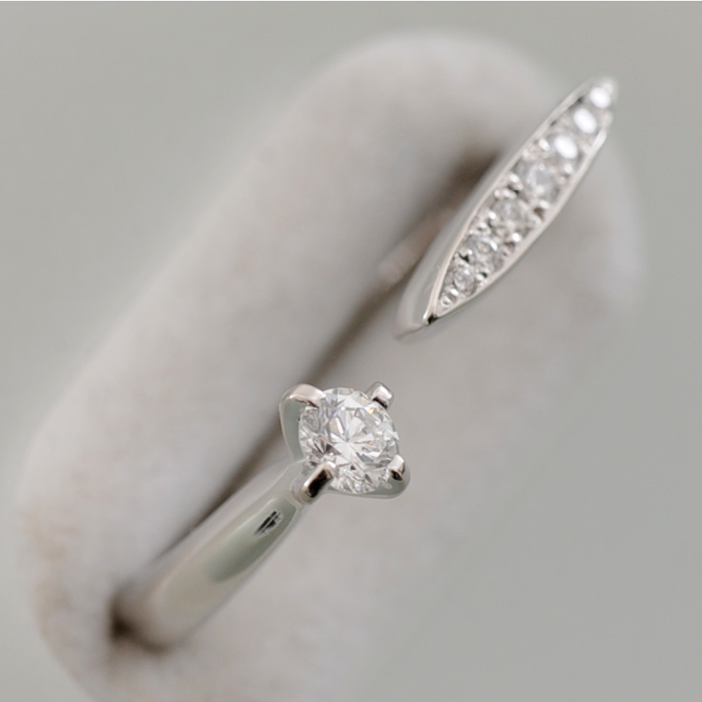 ● 材質:プラチナ900、ダイヤモンド(ラウンドブリリアンカット)1石、メレダイヤ7石(ラウンドブリリアンカット)