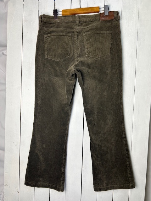 ●商品説明・・・アメリカ古着になります。 90年代~00年代初め頃のオールド ラルフローレンの中太畝の裾がフレアに広がったブーツカットシルエットのコーデュロイパンツです。横方向にストレッチ入りで動きやすくなっています。素材はコットン98%にストレッチ素材2%で秋冬春先向けのやや厚手な生地感です。色はダークブラウンです。サイズ表記的にレディース物かと思われますが、メンズライクなシルエット感で、レディースの大きめL~XL程度のサイズ感で、メンズの方も履いていただけるサイズ・シルエット感かと思います。