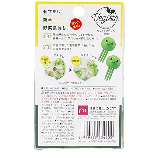 ・緑 直径2.5×高さ6cm 93460・・PatternName:ベジシャキちゃんのみ・刺すだけ簡単!野菜長持ち!シャキシャキ革命! 刺すだけ簡単! 野菜長持ち! 葉物野菜の成長点に芯に刺すことで、成長スピードを抑え、野菜の鮮度をキープ。使い方簡単! 葉物野菜の芯の中心に3本の脚を垂直に立て、手のひらで差し込むだけ。刺した葉物野菜は袋に入れ、冷蔵庫で保管。