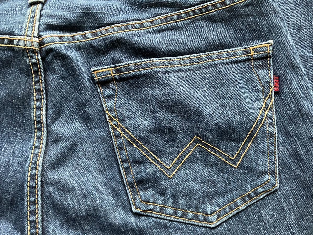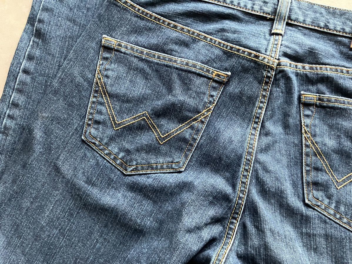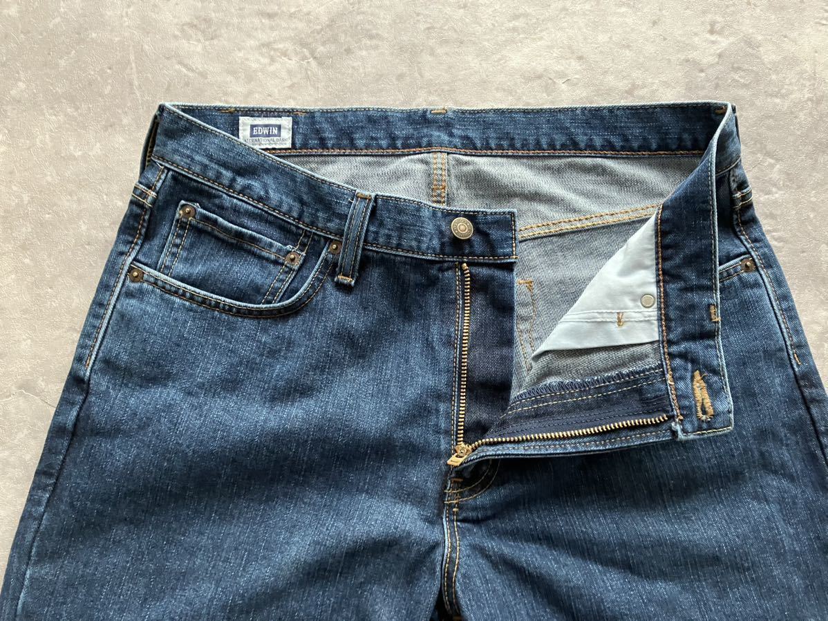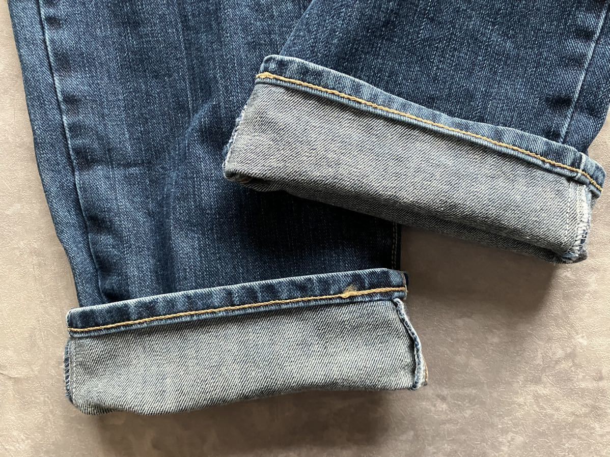 素材はコットン100%デニム、裾はおそらくカットなしのオリジナルチェーンステッチ仕様、濃いめ日本製ジーンズになります。