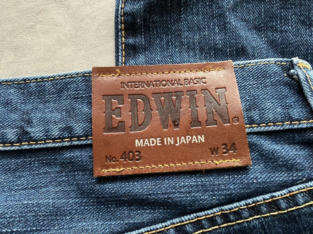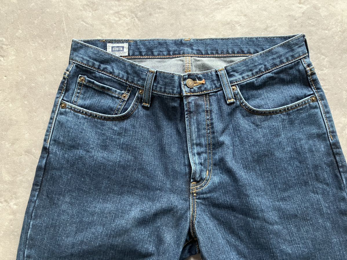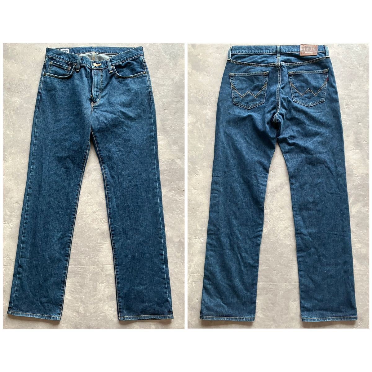 素材はコットン100%デニム、裾はおそらくカットなしのオリジナルチェーンステッチ仕様、濃いめ日本製ジーンズになります。