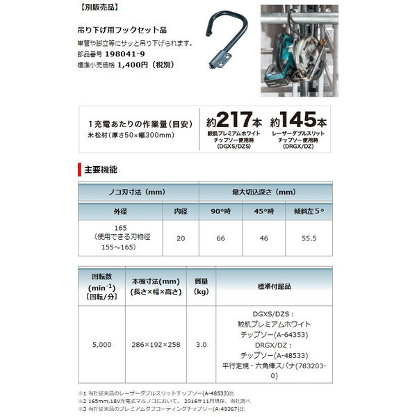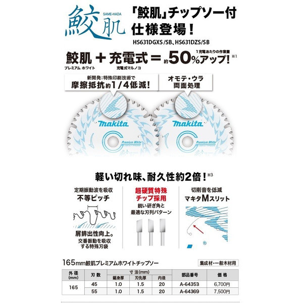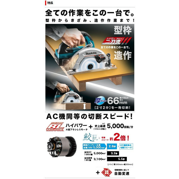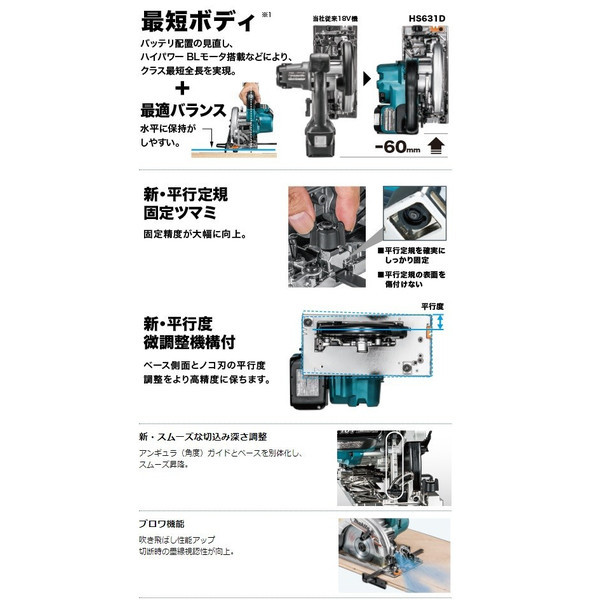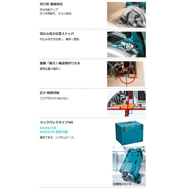 セット品をばらした商品です。純正ケース マックパックタイプ4をサービスでお付いたします。マキタ makita165mm充電式マルノコHS631DZSB ブラック本体+鮫肌チップソー付きです。※バッテリ・充電器・ケースは別販売品です。88381854580型枠からきざみ、造作作業まで!全ての作業をこの一台で。■AC機同等の切断スピード!■「鮫肌」チップソー付仕様登場!■最短ボディバッテリー配置の見直し、ハイパワーBLモータ搭載などのより、クラス最短全長を実現■最適バランス水平に保持がしやすい■新・平行定規固定ツマミ固定精度が大幅に向上■新・平行度微調節機構付ベース側面とノコ刃の平行度調節をより高精度に保ちます■新・スムーズな切込み深さ調整アンギュラ(角度)ガイドとベースを別体化し、スムーズ昇降。■ブロワ機能■切り粉 後部排出排出性能アップ、切り粉飛散をさらに低減。■切込み深さ任意ストッパ■墨線「後方」確認用切り欠き■左5°傾斜切断■マックパックタイプ4付き連結できるシステムケース