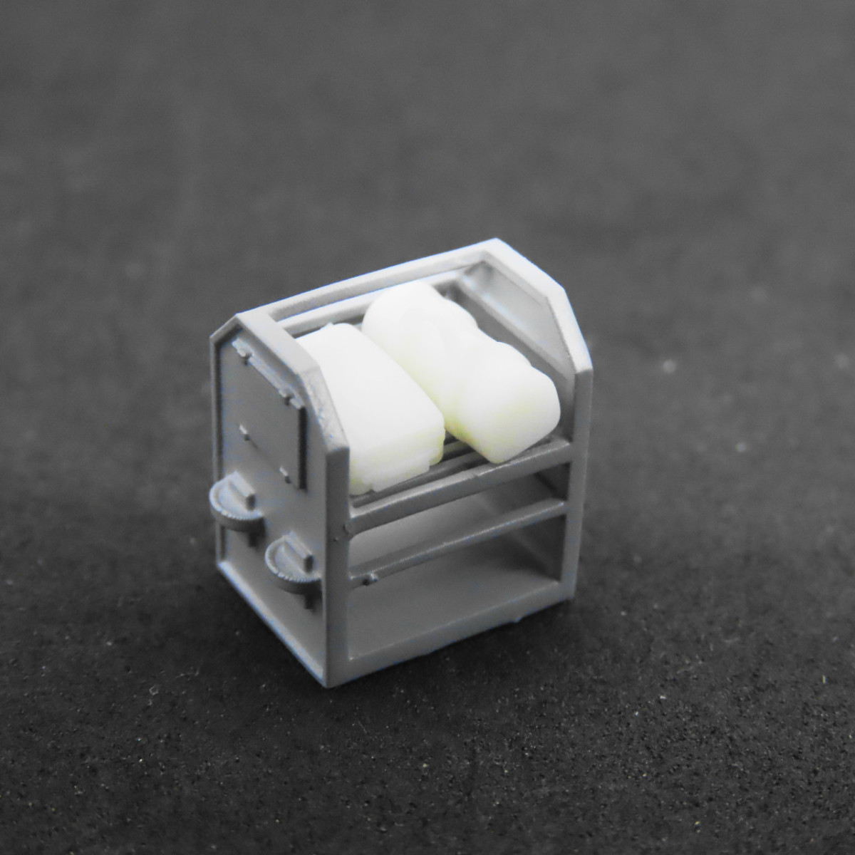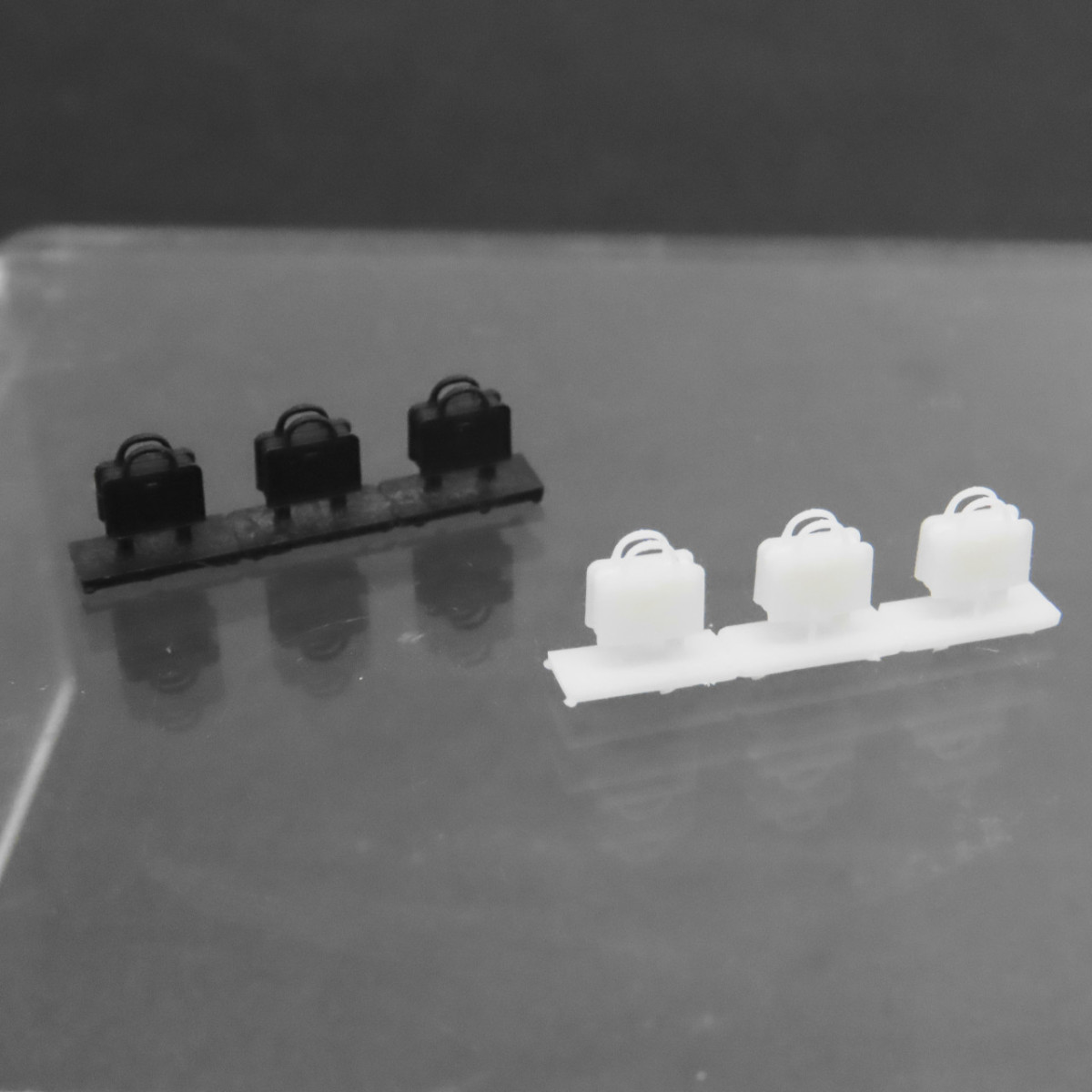 | TOMIX製(1/80)キハ261系向けの荷物棚用の手荷物です。 その他工夫次第でいろいろな使い方ができますが、 車内にあるのがわかりやすいよう、オーバースケールで大きめに作ってありますのでご注意下さい。 3Dプリンタ製でForm3用スタンダードレジン(白色)素材で出力されております。 お好きな色に着色してご利用下さい。 ※商品パッケージは一部異なる場合がございます。 | 使用方法 |