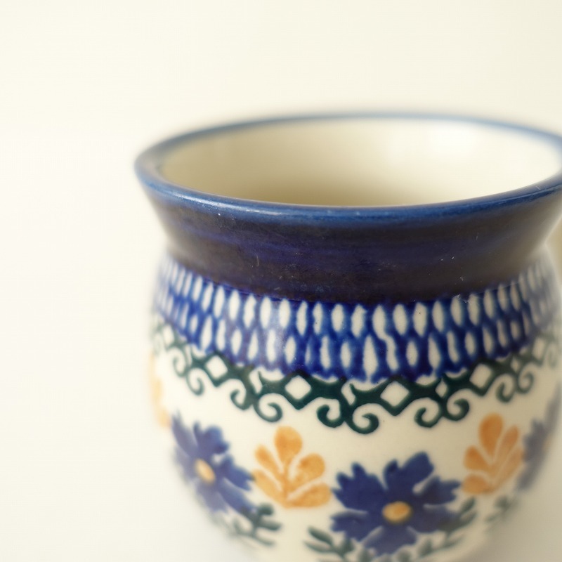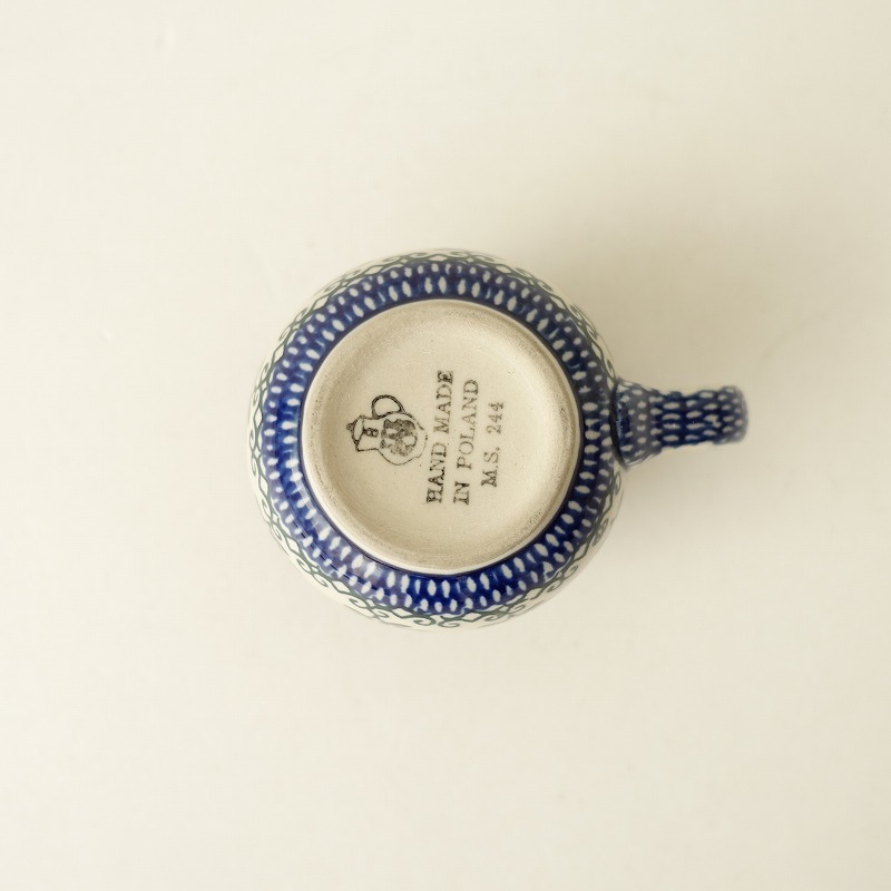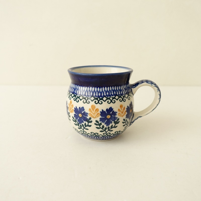 | Polish Potteryのポーリッシュマグカップです。 カラーはアイボリーベースに、ネイビー・ベージュなど、鮮やかな色彩を使って、繊細に絵付けされているうつわです。 膨らんだ形とすぼまった飲み口によって飲み物が冷めにくくなった、ポーランド陶器を代表するフォルムになっています。 |