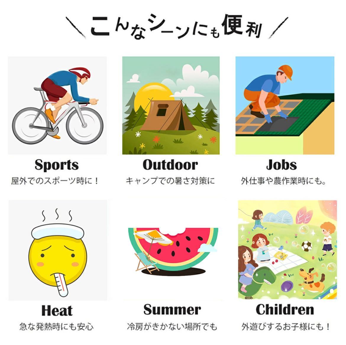 ゴルフ、釣り、バスケットボール、サイクリング、ハイキング、運転、ガーデニング、勉強中や仕事中、スポーツ観戦や野外活動、作業現場でもあらゆるシーンで活躍できます。やさしい冷え方でお子様や女性へのプレゼントにも喜ばれています!使用可能時間は30度~35℃の間で約60~120分完持続します。