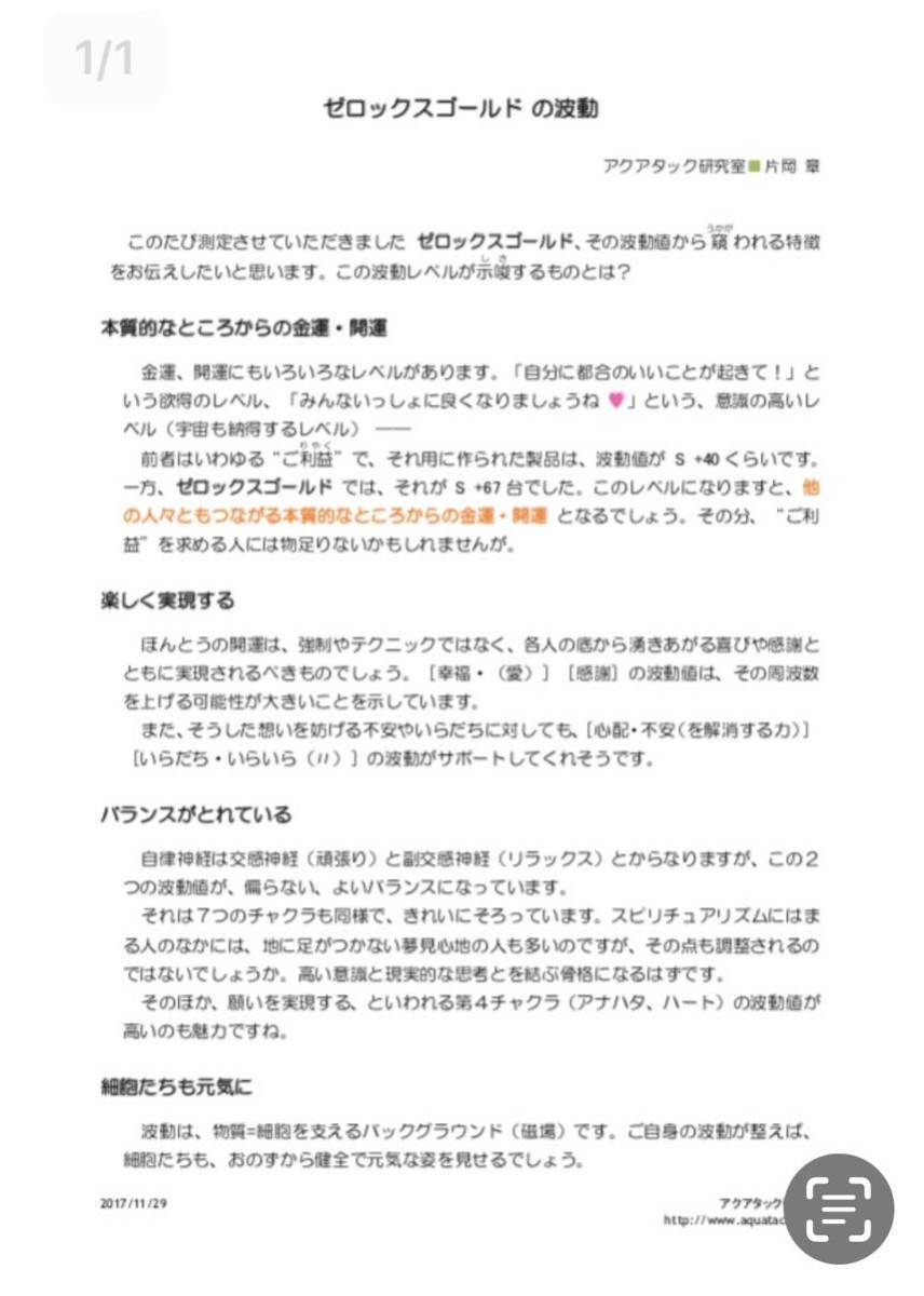 先月は素早く対応していただきありがとうございました。ゼロックスゴールドを使用して1ヶ月がたちました、気力が充実して毎日ワクワク過ごしています。寝るときは枕の下、お出かけの時も左ポケットに肌身離さず持っています。これといった開運体験はまだないですが、ネガティヴな感情がなくなってきたのは明らかに実感し、気力も充実しております。来月主人と娘に持たせようと検討しています。ゼロックスゴールドを朝日に照してキラキラを眺めていると とても波動があがり毎日楽しく過ごしています、ありがとうございました。また宜しくお願いします。