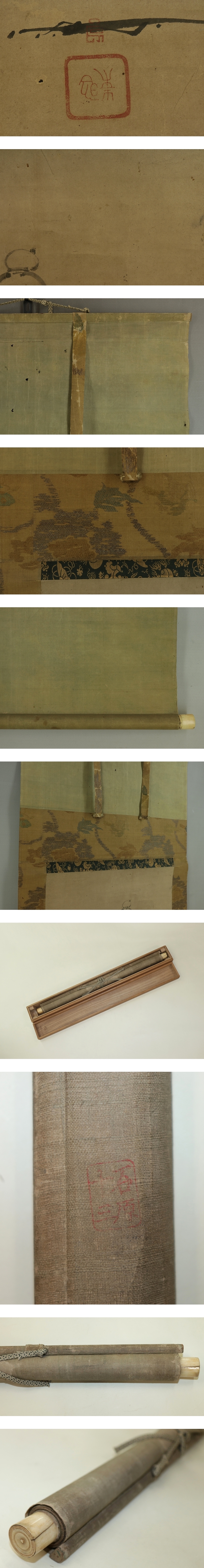 松花堂昭乗 しょうかどう-しょうじょう(1584-1639) 江戸時代前期の僧、書家。 天正12年生まれ。京都石清水八幡宮滝本坊の住職。書は松花堂流、滝本流と呼ばれる。 本阿弥光悦、近衛信尹と並んで寛永三筆の一人。 画、茶もよくし、水墨画に「葡萄に鶏図」がある。 寛永16年9月18日死去。56歳。堺(大阪府)出身。俗名は中沼式部。別号に惺々翁。 本紙は、染み、汚れ、強い折れ、皺、虫食い、ヤケがあります。 表装は、染み、汚れ、折れ、皺、虫食い、破れ、ほつれ、ヤケ、くすみ、 軸先に汚れとヒビがあります。 【サイズ】 作品 横約40cm×縦約34cm 表装 横約52cm×縦約117cm |