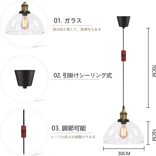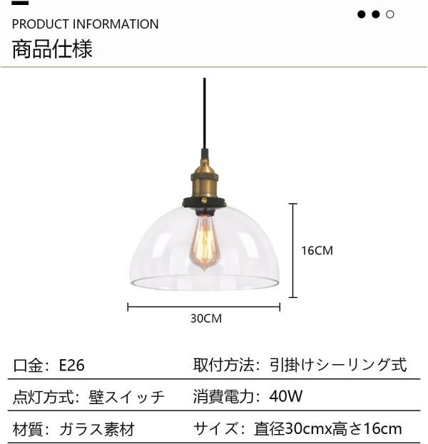 • 【商品仕様】サイズ:直径30cmx高さ16cm 。口金:E26。コード長さ:70cm自由に調整する。(70cm以上お選びいただいた場合、加工が必要ですので、どうぞご連絡ください。)点灯方式:壁スイッチ。取付方法:引掛けシーリング式、簡単に取り付けて、女性でも簡単に設置できます。材質:ガラス素材。色:クリア。消費電力:40W。定格工率:100V。LED電球、蛍光電球、白熱電球。※本商品に電球は付属していません。