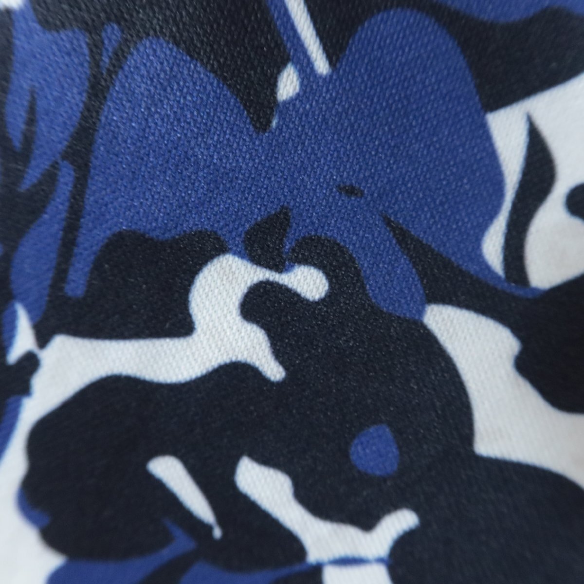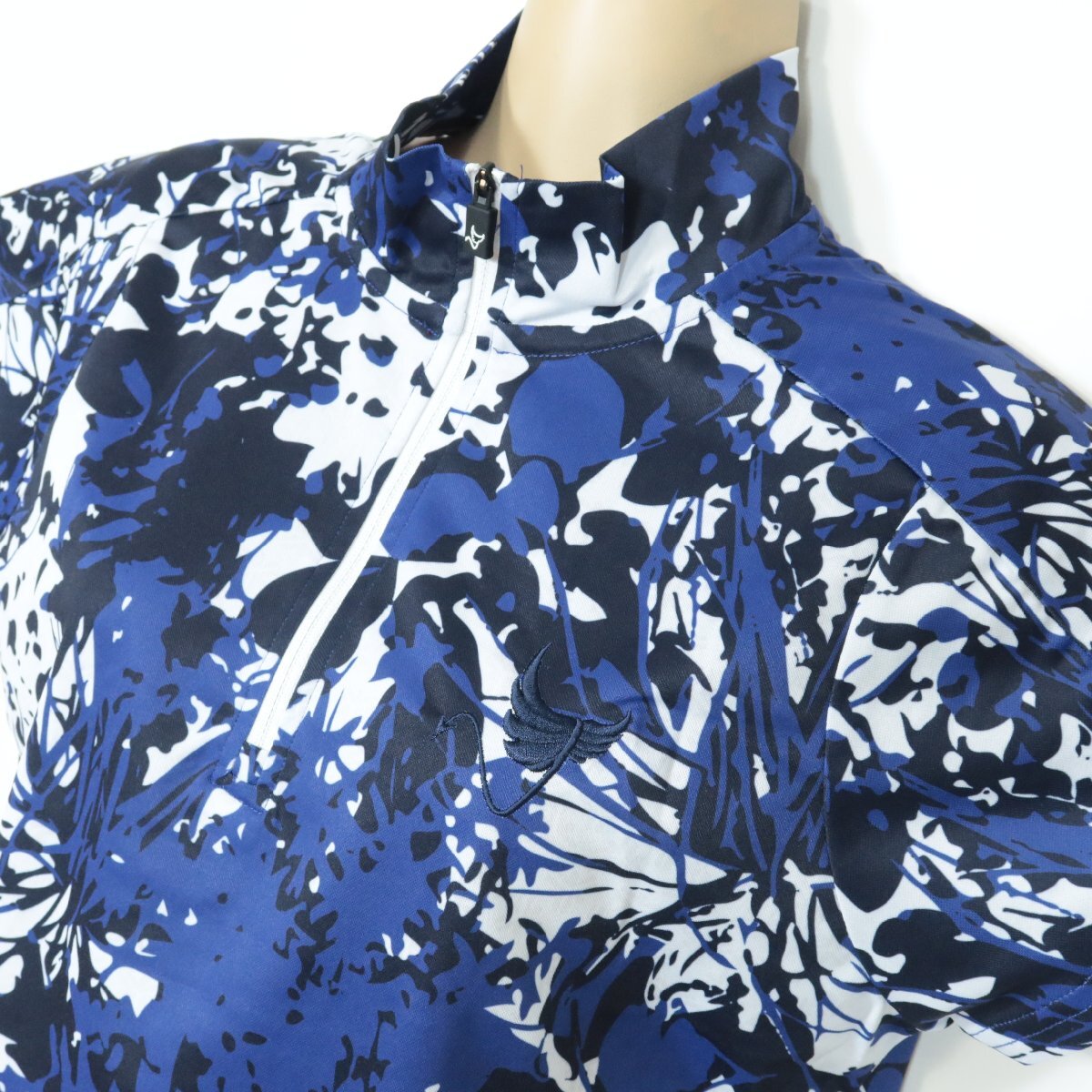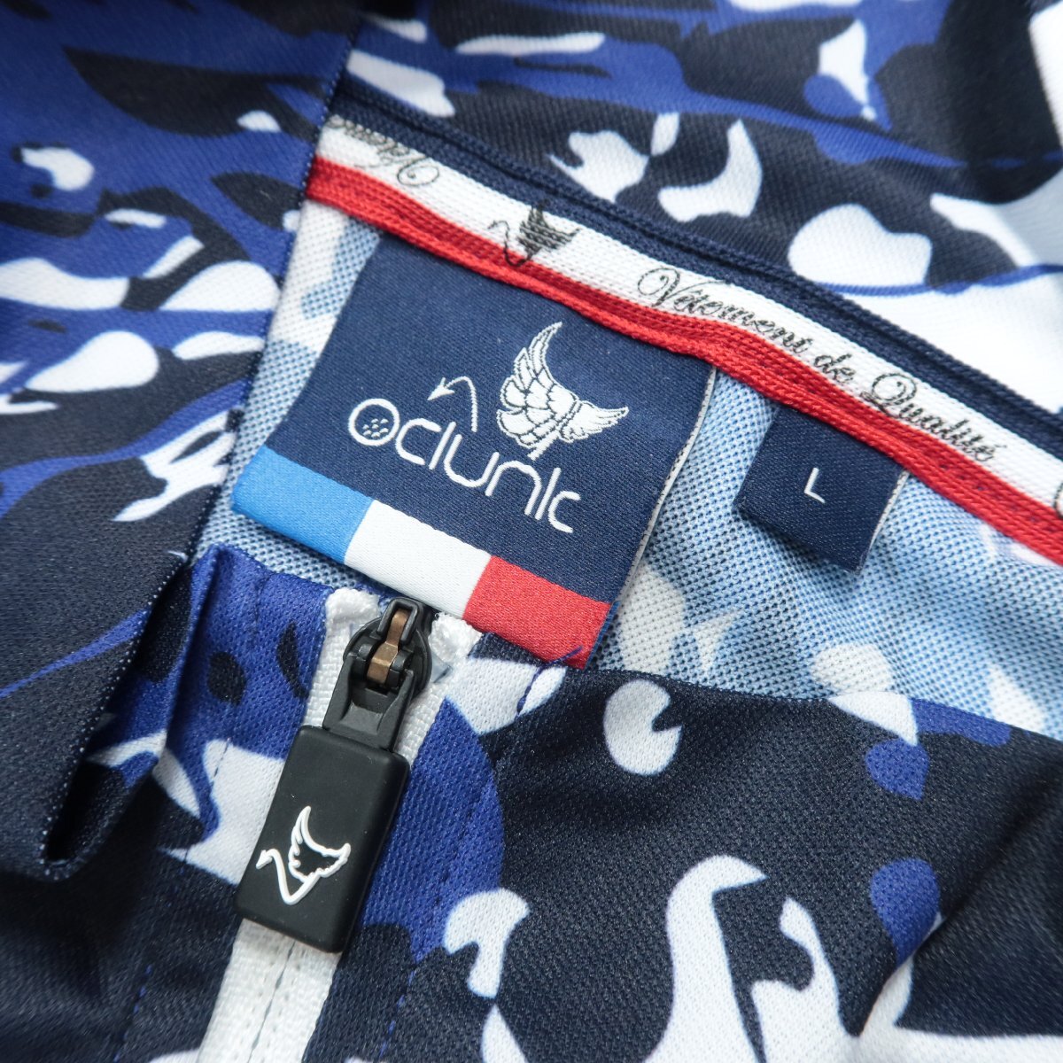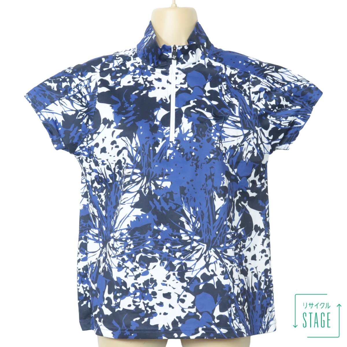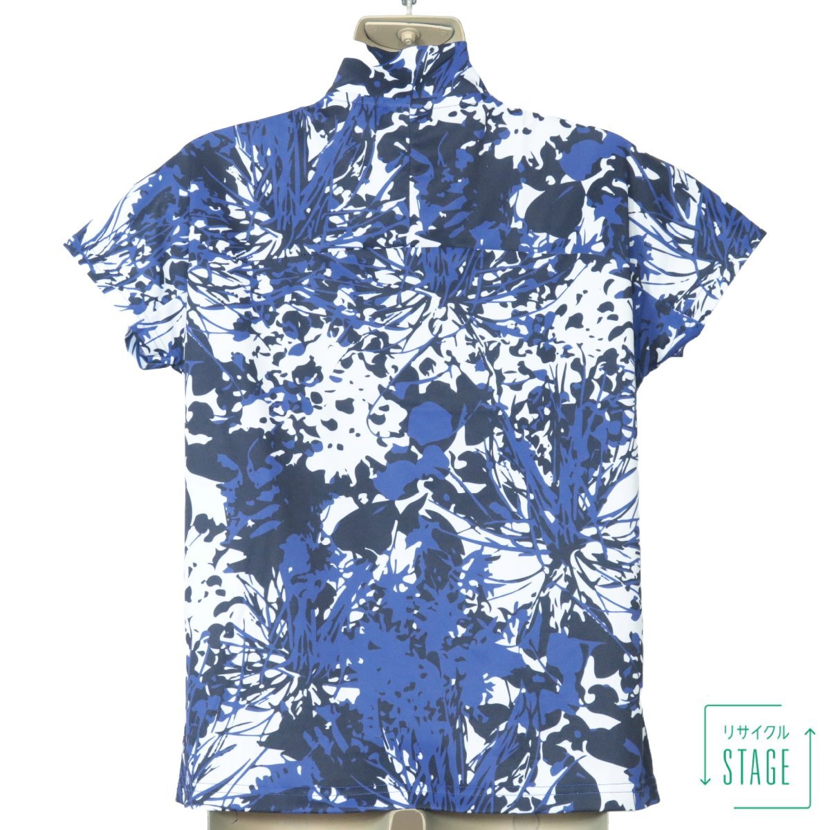 【美品!】Oclunlc クランク ★エレガントな重ねプリント♪スタンドネック プルオーバー 紺系 L ストレッチ 爽やか レターパック可 z7237