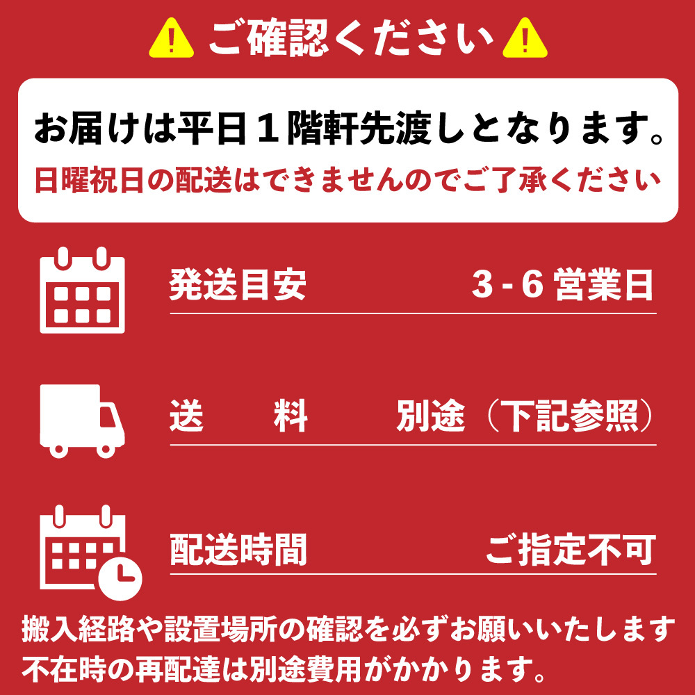 | ・ エスラインギフ(及び中継店) でのお届けになります。 ・運送会社のご指定は出来ませんのでご了承下さい。 ・配送時間は9:00-17:00の間の日中配送となります。(夕方以降の配送は出来かねます) ・持ち帰りとなった場合、再配送料がかかることがあります。必ずご対応いただける日程をご指定下さい。 【注意】時間指定・日曜、祝日の配達は出来ません。 |