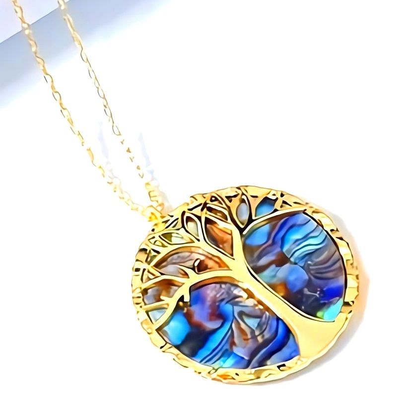 こちら黄金の世界樹彫刻に虹色の天然アワビ貝パールが美しいK18GFゴールドネックレスになります。