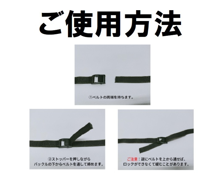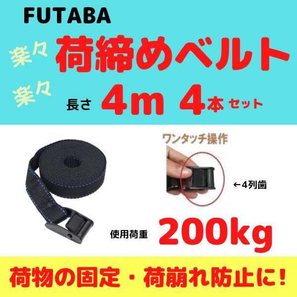 ワンタッチ式のラッシングベルトです。 誰でも楽に荷締め可能です。 ◆商品名◆ 荷締めベルト 4本セット ◆ブランド名◆ FUTABA ◆商品情報◆ ・サイズ:ベルト長さ4m、幅2.5mm、厚み1.2mm 注意)長さには、多少の誤差があります。 ・色:黒 ・材質:ポリエステル100% ・固定歯:4列 ・使用荷重:200Kg ・破断荷重:450kg 注意)自社テスト重量で保証するものではありません。 ・片面ステッチ入りでベルト寄れ防止にもなります。 ※ベルトのミシン糸は、掲載写真と色が異なる場合があります。また、色はお選びいただけませんので予めご了承ください。 ◆商品の状態◆ ・新品未使用 ◆商品の用途◆ パレットの積荷の荷崩れ防止、バイクの固定、季節のレジャー品の固定等様々な場面で大活躍 屋内、倉庫内の荷崩れ防止に、トランクや家具の開き防止、荷物を梱包固定するのに、引っ越しの際、オートバイ、キャンプ、アウトドア、スポーツ器具などの搬送道具のみならず様々な場面で活躍します。 注意事項 本製品は、荷物の固定専用で、けん引や吊り上げ、吊り下げには絶対に使用しないで下さい。 ◆発送方法◆ ・全国一律送料無料 ・ゆうパケット 「おてがる版」で配送 ・追跡番号有 不明な点はご質問下さい。 |