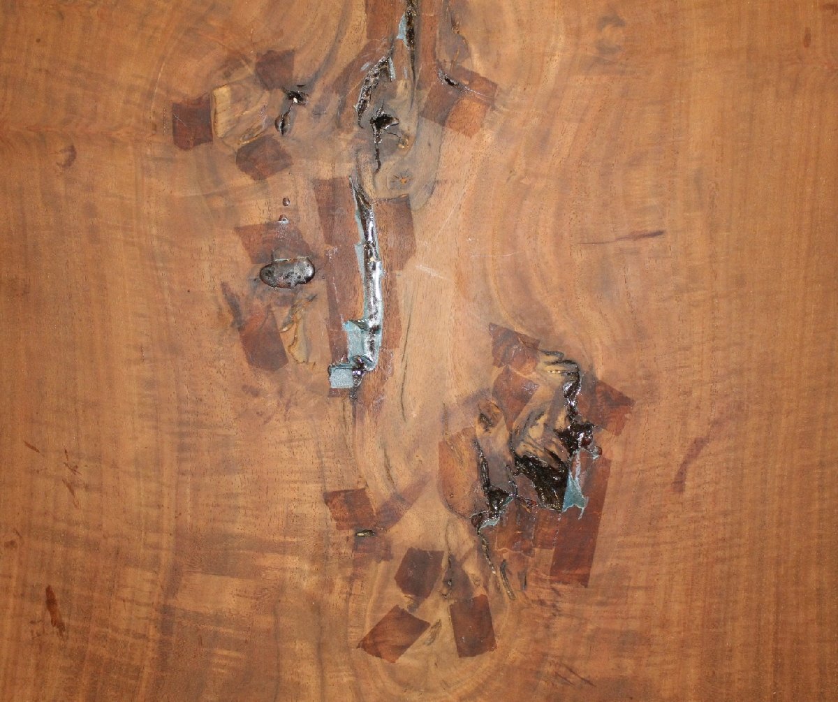 この板材は製材後20年以上経過しています。(自然乾燥)平面を出し、割れに樹脂を入れていますが未仕上げの状態です。