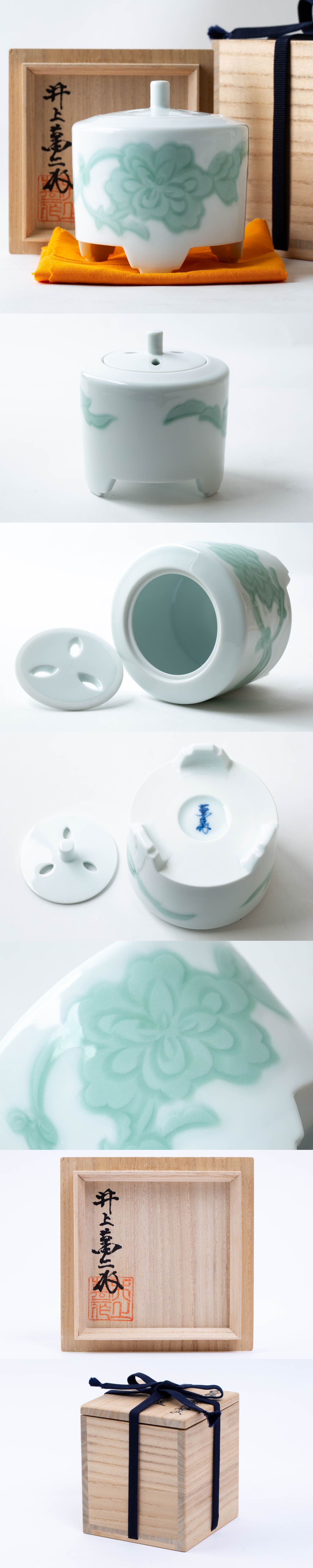 人間国宝 井上萬二 白磁緑釉牡丹彫文 香爐 香炉 共箱になります。