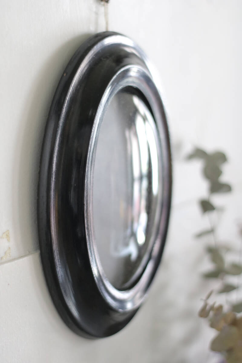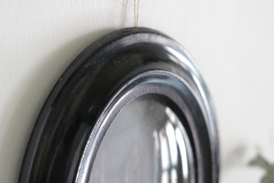 黒いオーバルフレームは木製で、木の木目を感じるしっかりとした物です。