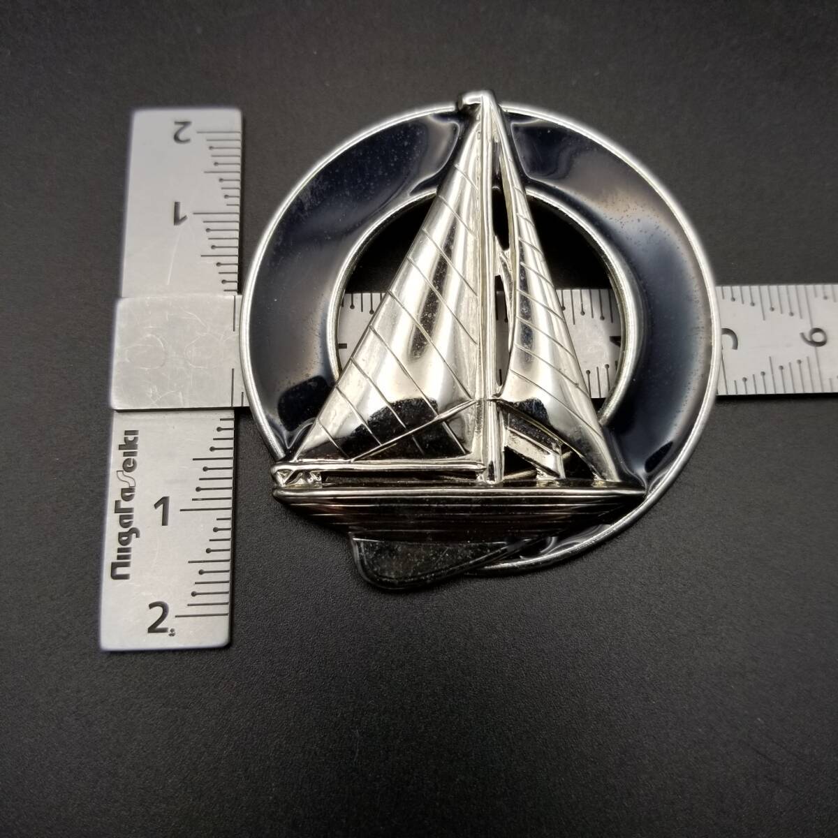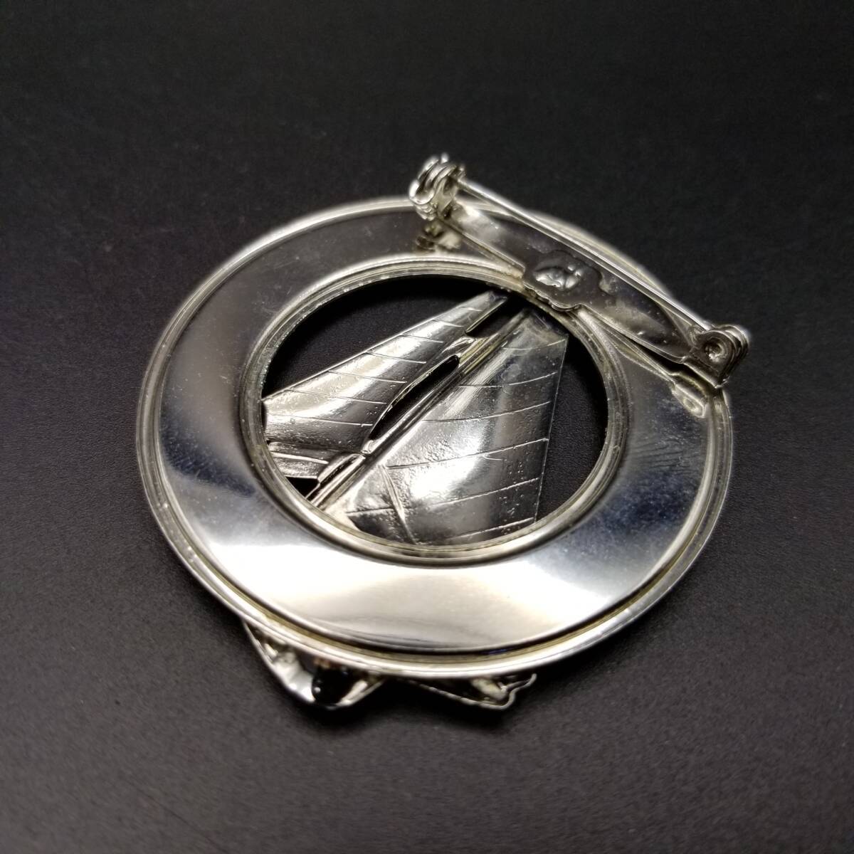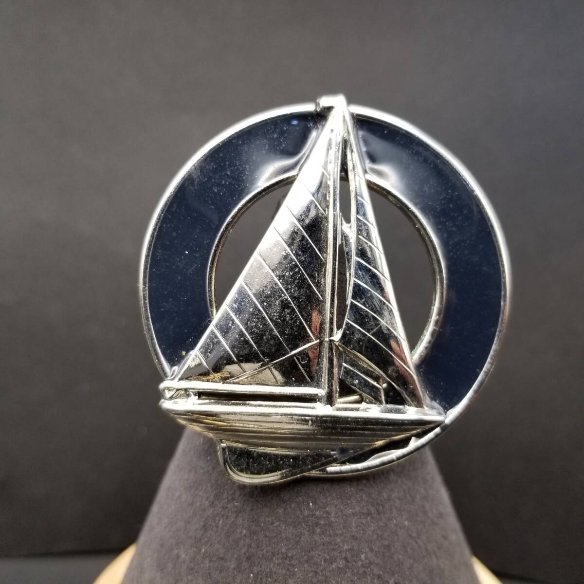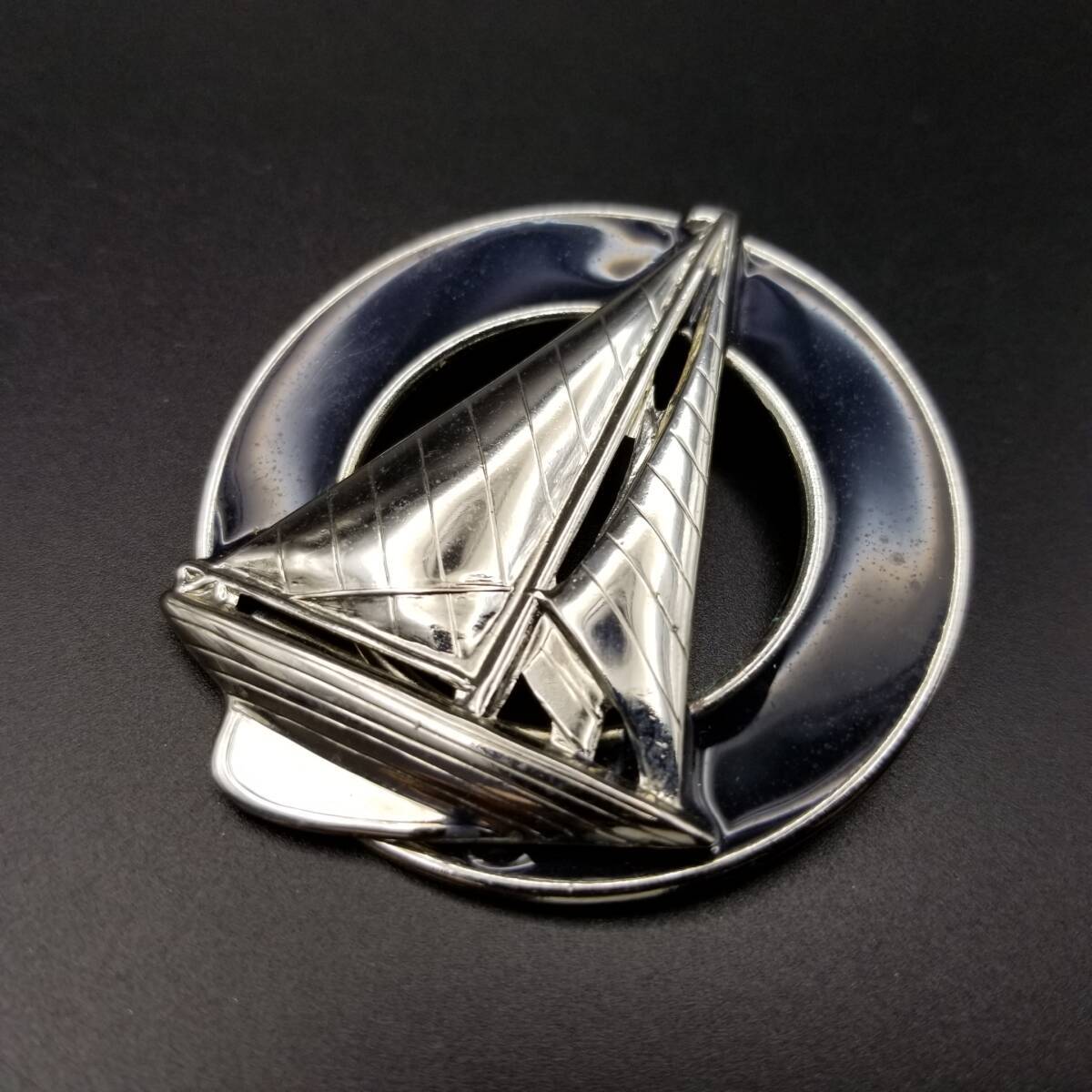 レトロ ヨット 海の乗り物 ラウンド ネイビーエナメル ヴィンテージ ブローチ シルバートーン 存在感 夏色 Y15-X