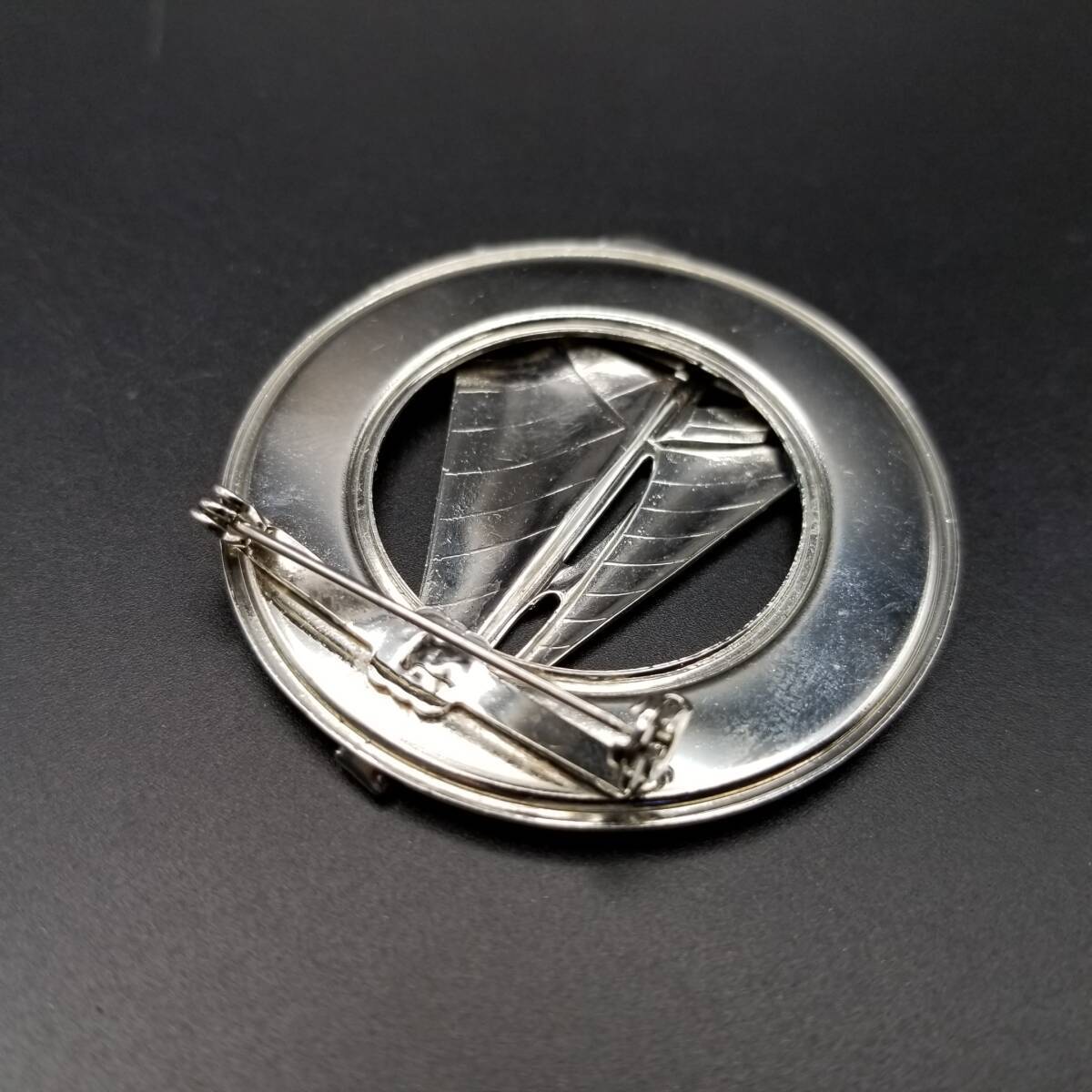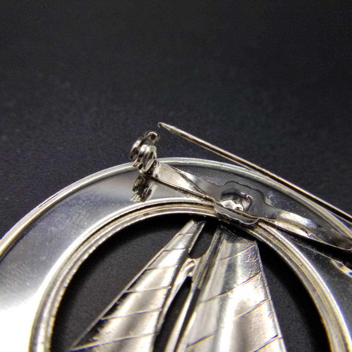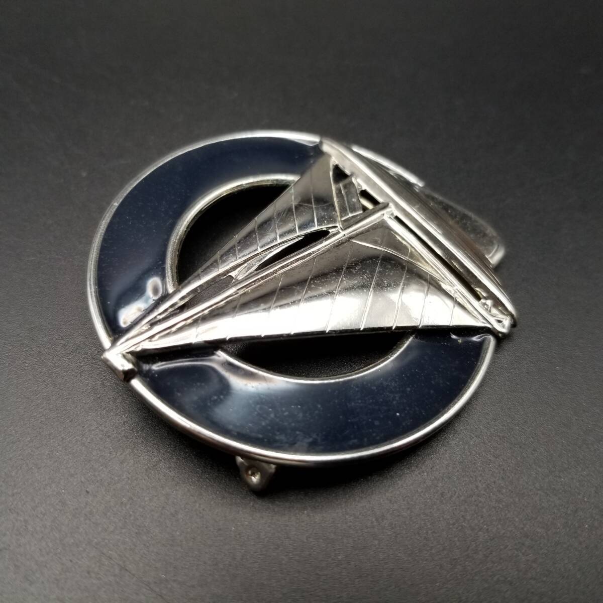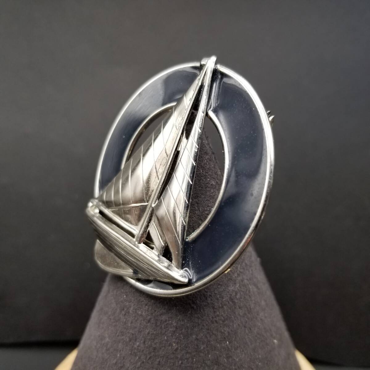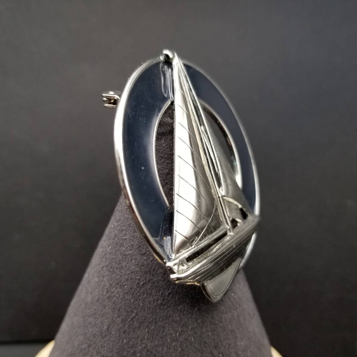 レトロ ヨット 海の乗り物 ラウンド ネイビーエナメル ヴィンテージ ブローチ シルバートーン 存在感 夏色 Y15-X