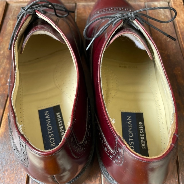 アメリカで購入しましたレザーシューズです。メーカーはボストニアン アメリカ製になります。インソール奥にmade in usaの表記が確認できます。素晴らしい一足です。表記サイズは9 1/2 D/B, アウトソール長さ30.5cm、アウトソール最大幅11cmです。 おおおよそですが26.5〜27cm位の方向けです(足の形状によりますので参考まで)。状態は良好ですが、USED品につきビンテージ物とご理解頂いてお願い致します。