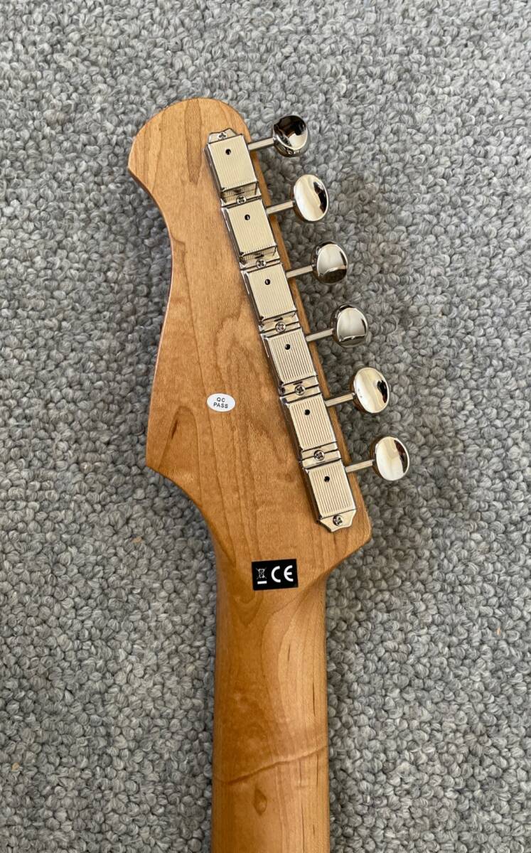 ネックポジションとミドルポジションにはアルニコⅤのシングルピックアップが搭載されていますが、ブリッジポジションのみセラミックマグネットのシングルサイズハムバッカーが搭載されていますので、とてもバランスがよく各ピックアップの音量差も感じられません。ボリュームノブのプッシュ&プルでコイルタップを切り替えることも可能です。ボディはバスウッドらしい明るめの響きで、ピックアップの影響も重なり本家ストラトキャスターのようなピーキーさや弾きにくさは感じられず、明るく元気な音でよく鳴ってくれる印象です。ネックシェイプは厚くもなく薄くもなく丁度良い印象です。