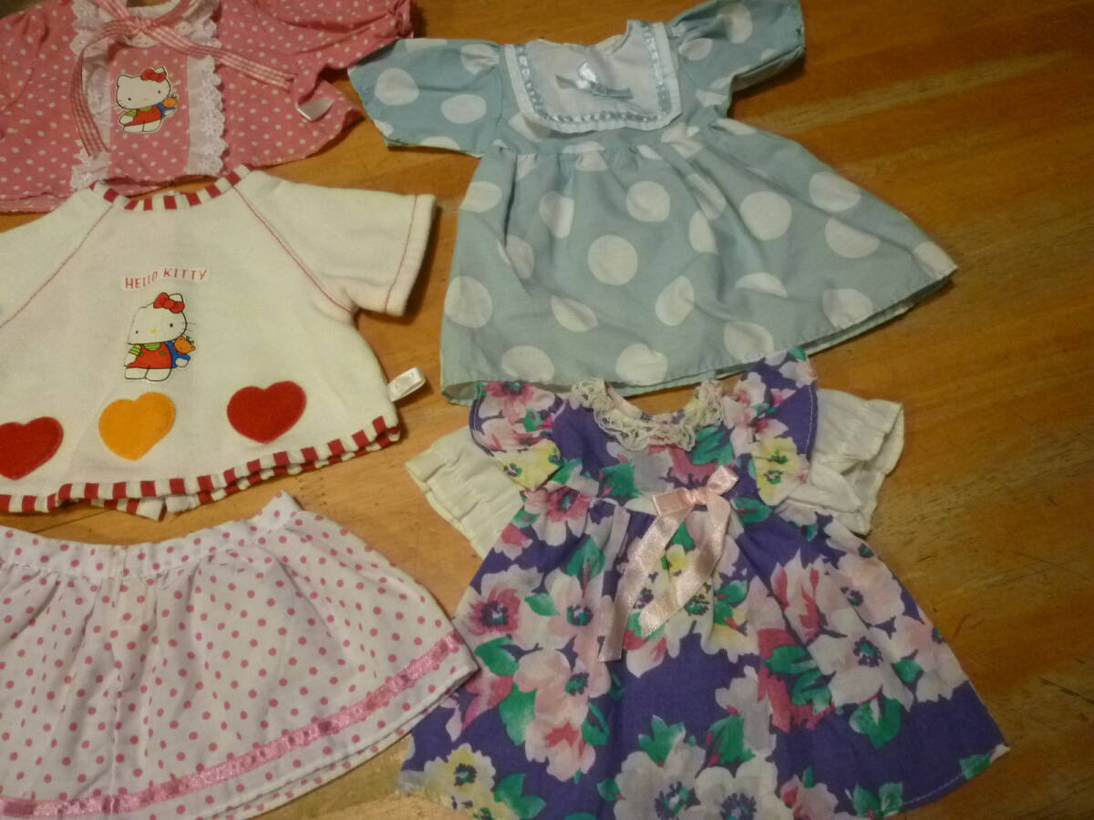 こちらは女の子が大好きなお世話人形の少し大き目タイプのお着換えセットとなりメーカー色々で、組み合わせ等は当方の判断でとなります。キティちゃんプリント入りやセサミストリートのエルモ名プリント入りジーンズ、その他にワンピースやスカート等のセットになります。