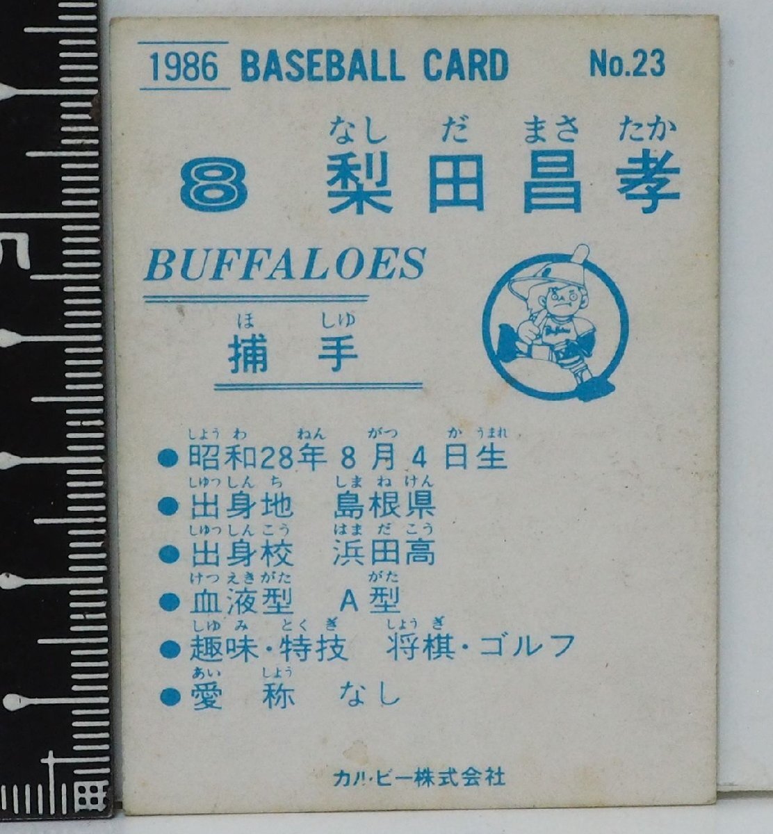 86年 カルビー プロ野球カード No.23【梨田 昌孝 捕手 近鉄バファローズ】昭和61年 1986年 当時物 Calbee おまけ 食玩 BASEBALL【中古】