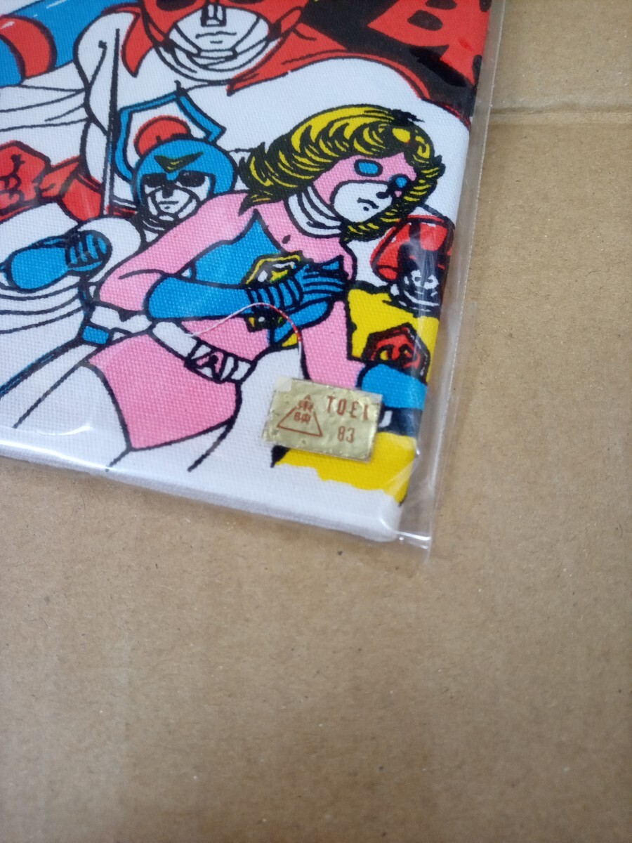 1970年代(1979年)の特撮、戦隊物、ヒーロー番組、バトルフィーバーJ のコップ入れ です。いわゆる給食袋、巾着袋ですね。