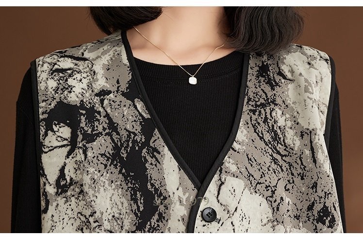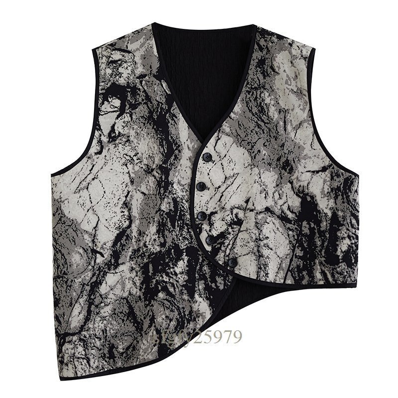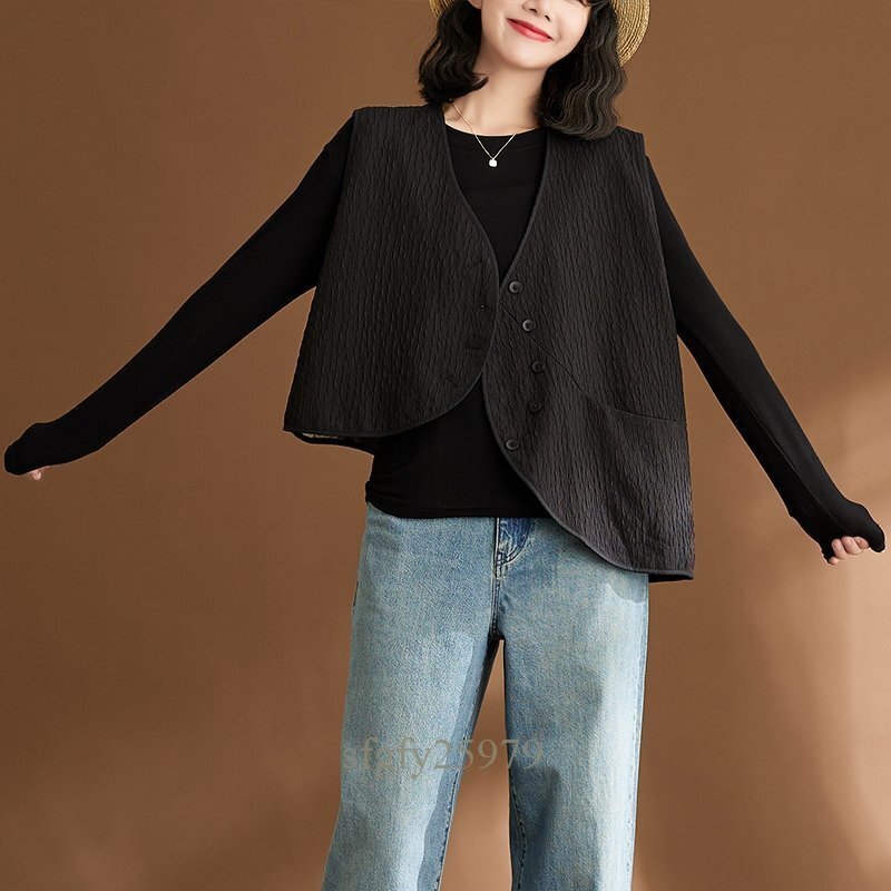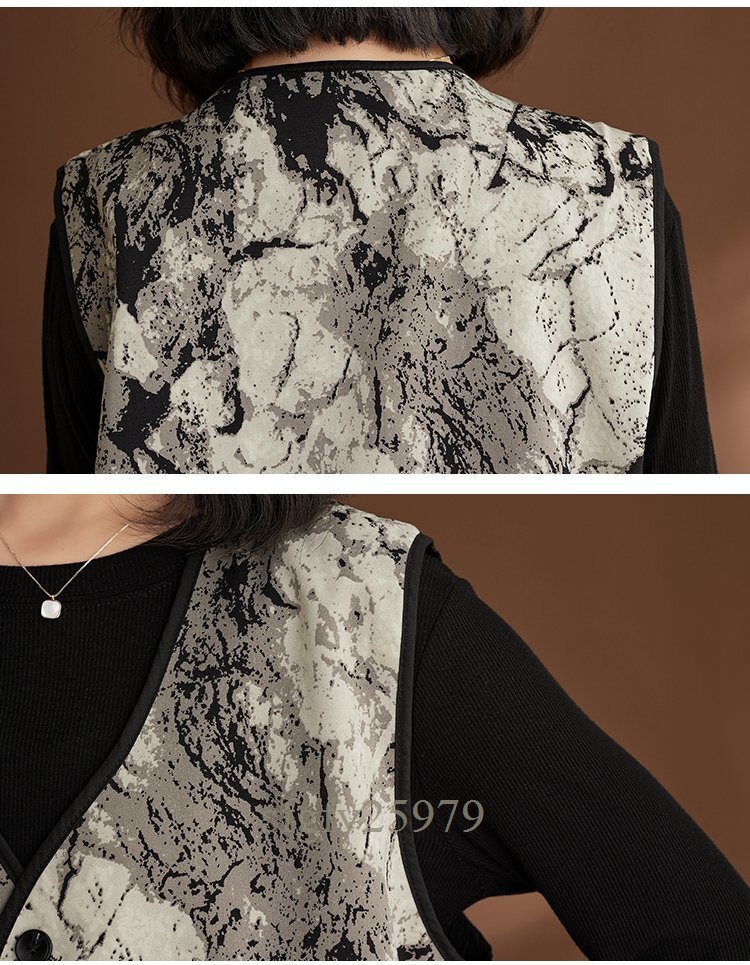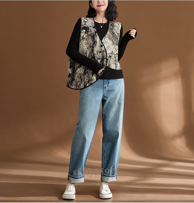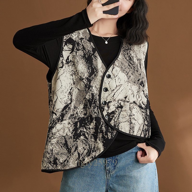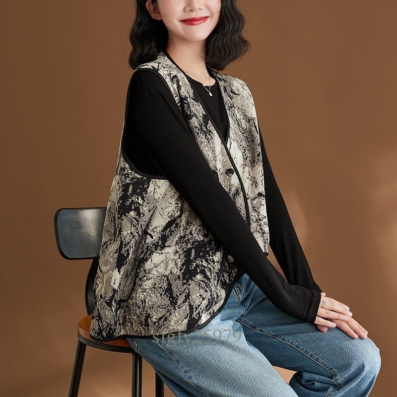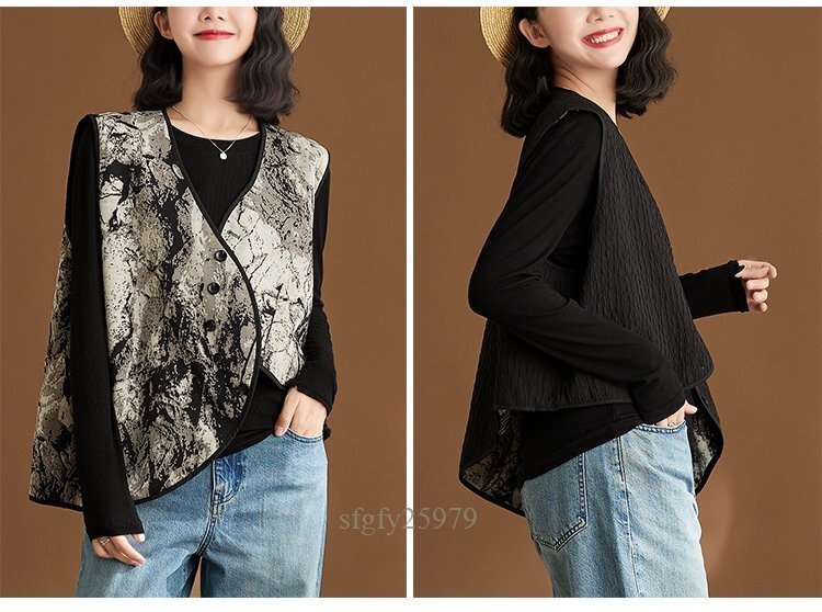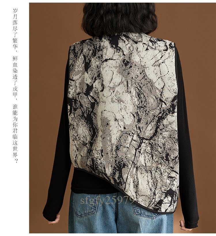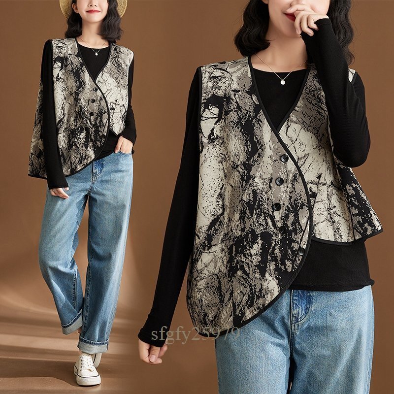 A5314☆新品秋カジュアル ナチュラル 着回し 不規則 2WAY プリントン ゆったり大きいサイズ 袖なしベストコート M~XXL