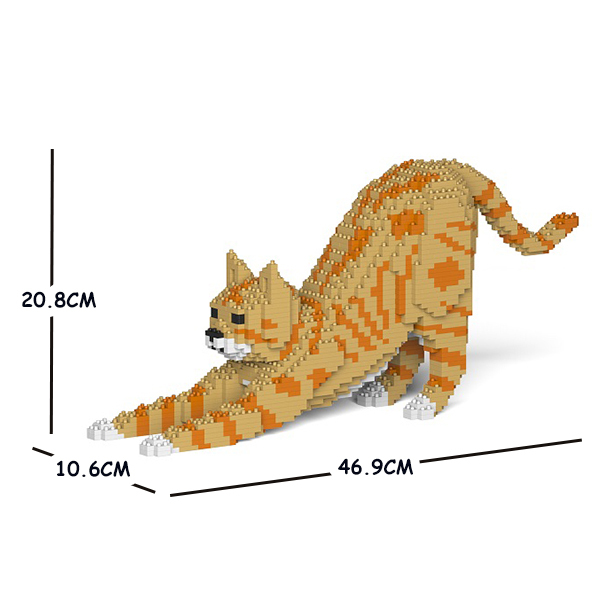 茶トラ柄の猫が大きく伸びをしています。リアルな表情で今にも動き出しそうです。