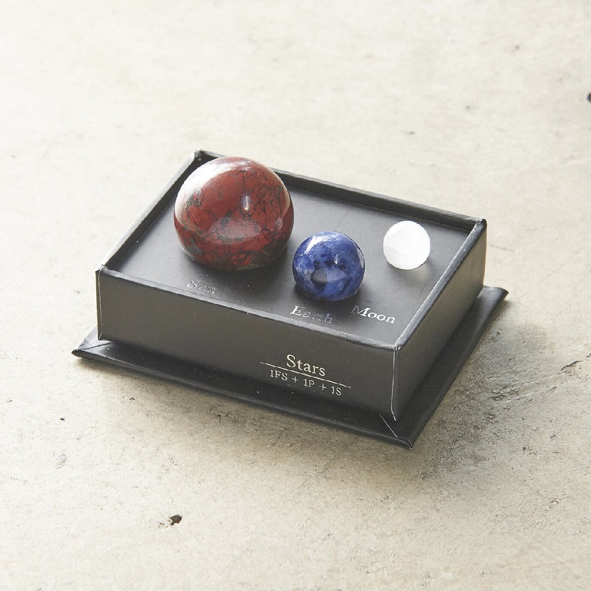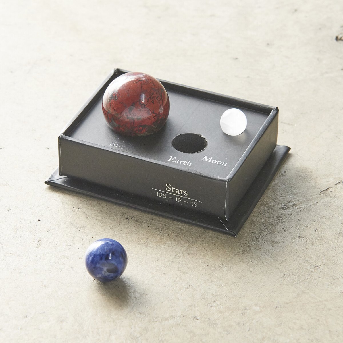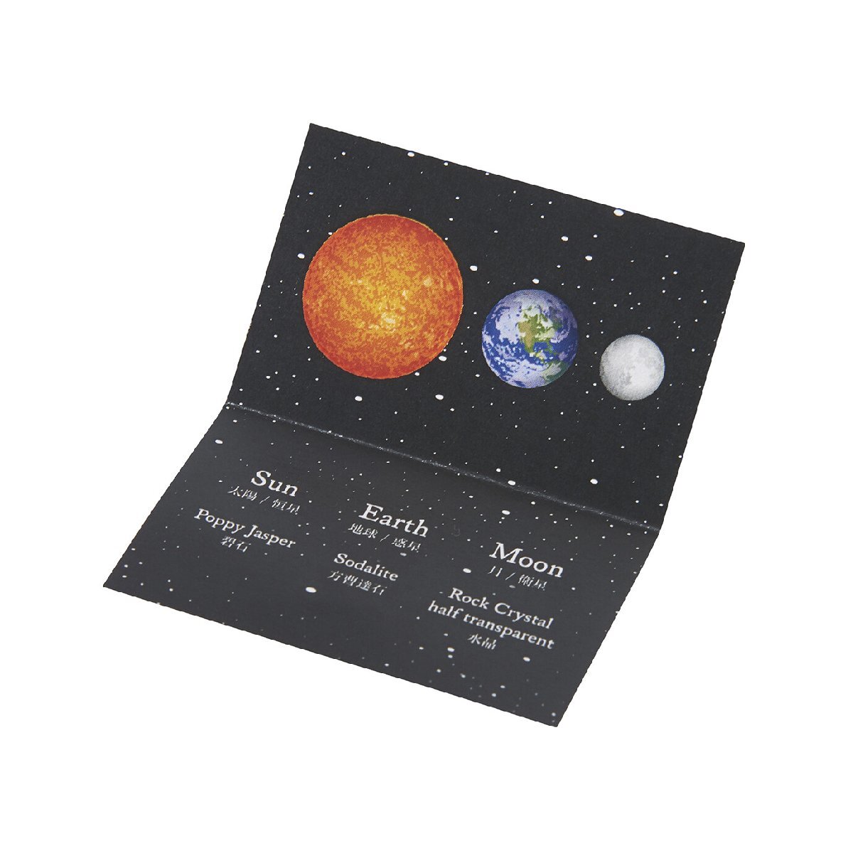 太陽系の中心にあたる太陽と惑星、さらに月をジェムストーン(天然石)で表現し、手のひらに乗せたり自分好みに並べたりと様々な楽しみ方ができます。