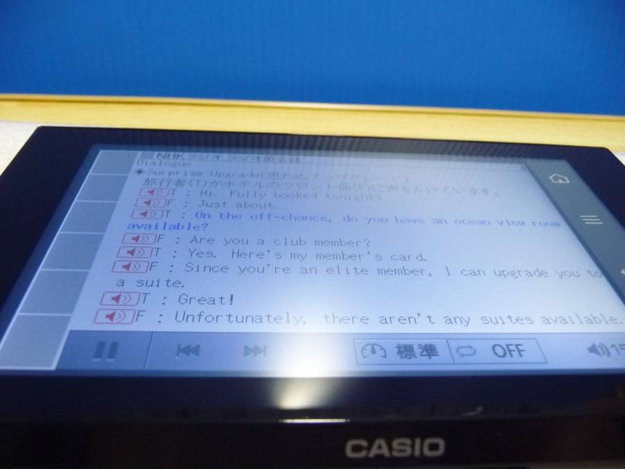 | 商品説明 | 製品:CASIO カシオ デジタル英会話学習機 EX-word RISE (40コンテンツ収録) XDR-A10(WE) [ホワイト] です。 大手家電量販店購入の展示品です。 即決です。消費税はかかりません。 まずまずキレイな部類の展示品だと思います。 (箱の状態はイマイチです) たくさん画像を掲載しておりますので、 外観状態は画像をご参考にして下さい。 (ヤフオクからご覧になった方が制限なくたくさんの画像を閲覧できます) 主観の差はご容赦下さい。 付属品は全部揃っています。 出品前に充電とタッチパネル操作、コンテンツの再生などの 簡易動作確認をしております。 (動作OK) 購入後は上述の充電+数分程度の動作確認を除き未使用です。 ◆付属品・・・箱裏や箱の見開きや取扱説明書の付属品欄より /CASIO エクスワード RISE XDR-A10(WE) 本体 /専用ACアダプター /ACアダプター用USBケーブル /取扱説明書(保証書付き) と /充電する場合のご注意(コピー) ◆製品 この一台で英会話が習得できる。新発想の[デジタル英会話学習機] 時間とシーンに合わせて3ウェイスタイルで英会話が学習できる デジタル英会話学習機。40コンテンツを収録し、5.3型タッチパネルを搭載。 片手で持つ、ポケットに入れてリスニング、 ディスプレイをスライドしキーボードで文字入力、 ディスプレイを立ち上げ置いて使うなど、使い方が多様。 英語習得に必要な力をボキャブラリー・リスニング・スピーキング・テスト対策の 4つにカテゴライズし、レベルや進捗に合わせて能率的に学習できる。 ■リズムで楽しみながら記憶に残るキクタンシリーズ リズムに乗って読み上げられるネイティブ発音を聞いて英単熟語を暗記。 英単熟語とその意味が続けて発音されるので、セットで覚えられます。 ■リスニング ネイティブ独特の発音を聞き取り、生きた言葉として理解することで コミュニケーション力のベースを築き上げます。 ■リアルな楽しい会話を毎日聞く 音声とテキスト収録で耳と目からネイティブの生きた英語を学びます。 英会話、基礎英語、ビジネス英語と幅広く学べます。 ■ネイティブ独特の音声変化を身につける 「on it = オニット」のように、独特の音声変化が聞き取れるように、 ルールと実例を紹介。フレーズクイズに挑戦して覚えた発音の確認ができます。 ■スピーキング 相手に伝わる正しい発音と会話力を育てます。 自らの発音を確認することで、より実践的なトレーニングにつながります。 ■3ステップで英会話をマスター デイビッド・セイン先生のオリジナルメソッドをコンテンツ化。 身近なストーリーを楽しみながら、 インプット・メモリー・アウトプットの3ステップで学習し、 実践的な会話力を磨きます。 ■実際の会話にチャレンジ 対話形式のネイティブ発音と文章(スキット)を収録。 相手のセリフに答えるように発音すると、その音声が録音され、 お手本の音声と聞き比べることができます。 ■発音を採点・アドバイスしてくれる ■テスト対策 TOEICやTOEFLなど、英語力を測定するテストのスコアアップをバックアップ。 解き方を知る、問題を解くという一連の学習が可能です。 ■解くためのコツを覚える テストのパートごとに、解答を導くための見るべきポイントをやさしく解説。 ■公式問題集で実践力を身につける 【優れたパフォーマンス】 ■直感的に操作・入力 5.3型タッチディスプレイを採用し、項目やソフトキーボードに直接触れることで 操作・入力が可能。ハードキーボードでの操作・入力にも対応しています。 ■頻繁に使うコンテンツにすばやくアクセス ホーム画面に、コンテンツを5つまで登録可能。 コンテンツを探し出す手間が省け、能率的に学習できます。 ■ネイティブの発音が聞ける ネイティブスピーカーの音声を収録し、実践的なリスニング学習が可能。 画面を消灯した状態でも音声を再生することができ、 カバンなどに入れたままのリスニング学習も可能です。 ・英単語約10万語ネイティブ発音 ■自分の発音を録音できる マイクを内蔵し、自分の発した音声を録音することができます。 お手本のネイティブ発音と聞き比べることで、自分の発音を客観的に分析。 ■リスニング学習のための操作パネル 再生/停止、次送り/前戻し、音声スピードの調整などができる 音声プレイヤーをリスニング時に表示。 学習状況に合わせてスムーズにコントロールできます。 ■辞書機能も搭載 ジーニアス英和辞典や和英辞典を収録し、 意味のわからない単語や熟語などをスピーディーに調べることができます。 ■スマートフォン連携で、学習がさらに能率的に: クラブエクスワード ◆詳細はメーカーサイトで確認して下さい https://casio.jp/det/products/XDR-A10/ ・スペック https://casio.jp/det/products/XDR-A10/spec/ ・収録コンテンツ https://casio.jp/det/products/XDR-A10/contents/ *** 『あなたがアクセスしようとしているリンク先は Yahoo! JAPANのサイトではありません。 IDやパスワードを要求するサイトにご注意ください。』 と表示されます