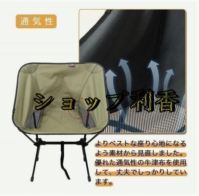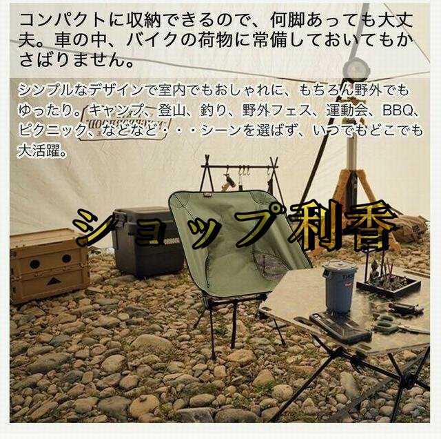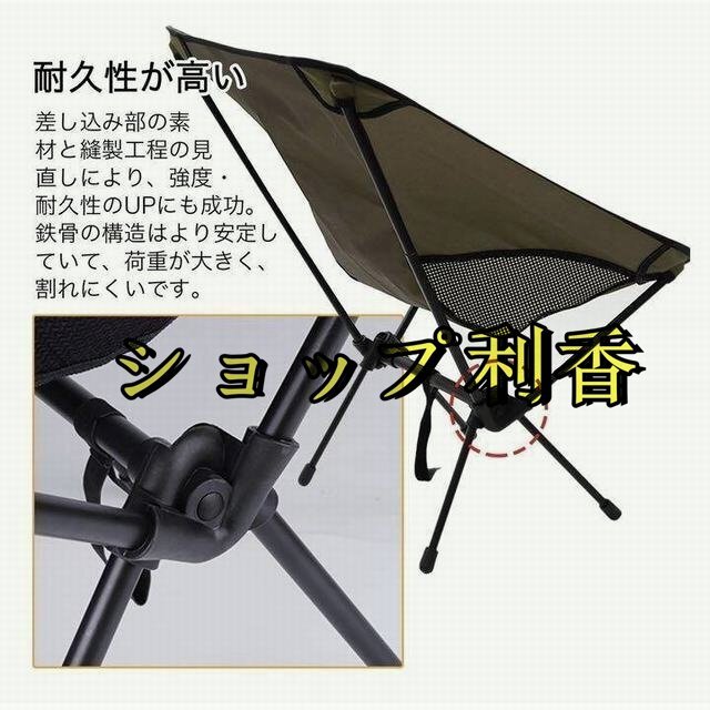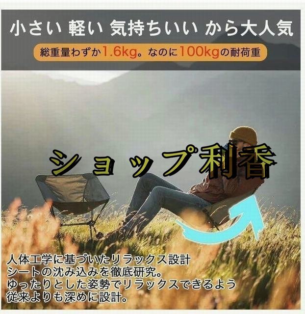 "【注意】:収納袋や細かいところは仕入れるロットによって異なる可能性がございます。ご了承ください。 【軽量】: 小さい 軽い 気持ちいい から大人気。 総重量わずか1.6kg。 耐荷重:100kg。 気軽に持ち歩いて使える、コンパクトなチェア。 【ベストな座り心地】: よりベストな座り心地になるよう素材から見直しました。 優れた通気性の牛津布を使用して、丈夫でしっかりしています。 人体工学に基づいたリラックス設計、シートの沈み込みを徹底研究。 ゆったりとした姿勢でリラックスできるよう、従来よりも深めに設計。 【耐久性が高い】: 差し込み部の素材と縫製工程の見直しにより、強度?耐久性のUPにも成功。 鉄骨の構造はより安定していて、荷重が大きく、割れにくいです。 【組み立てが簡単】: 収納袋から出して束ねてあるゴムを外せば、骨組みに内臓されているワイヤーゴムが引っ張りあうので、簡単に組み上がります。 【収納袋付属】:専用収納袋がついているので、収納スペースを食わず持ち運びに便利で楽です。"