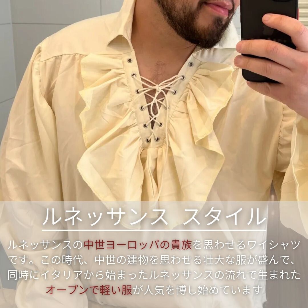 ルネッサンスの中世ヨーロッパの貴族を思わせるワイシャツです。この時代、中世の建物を思わせる壮大な服が盛んで、同時にイタリアから始まったルネッサンスの流れで生まれたオープンで軽い服が人気を博し始めています