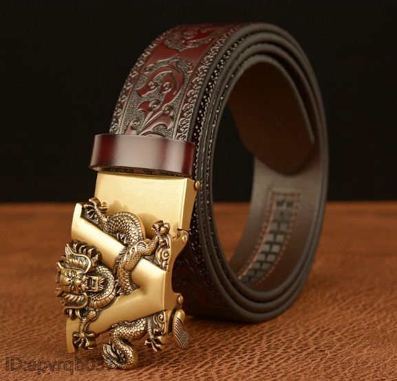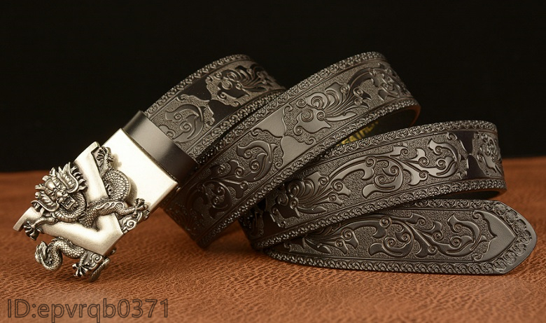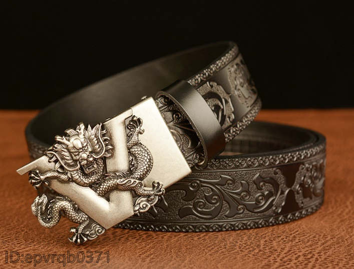 レザーベルト※新品 オートロック式 バックル ドラゴン龍 本革 メンズベ ルト 幅3.5センチ 柄物 紳士 長さ調整可能 /シルバー黒